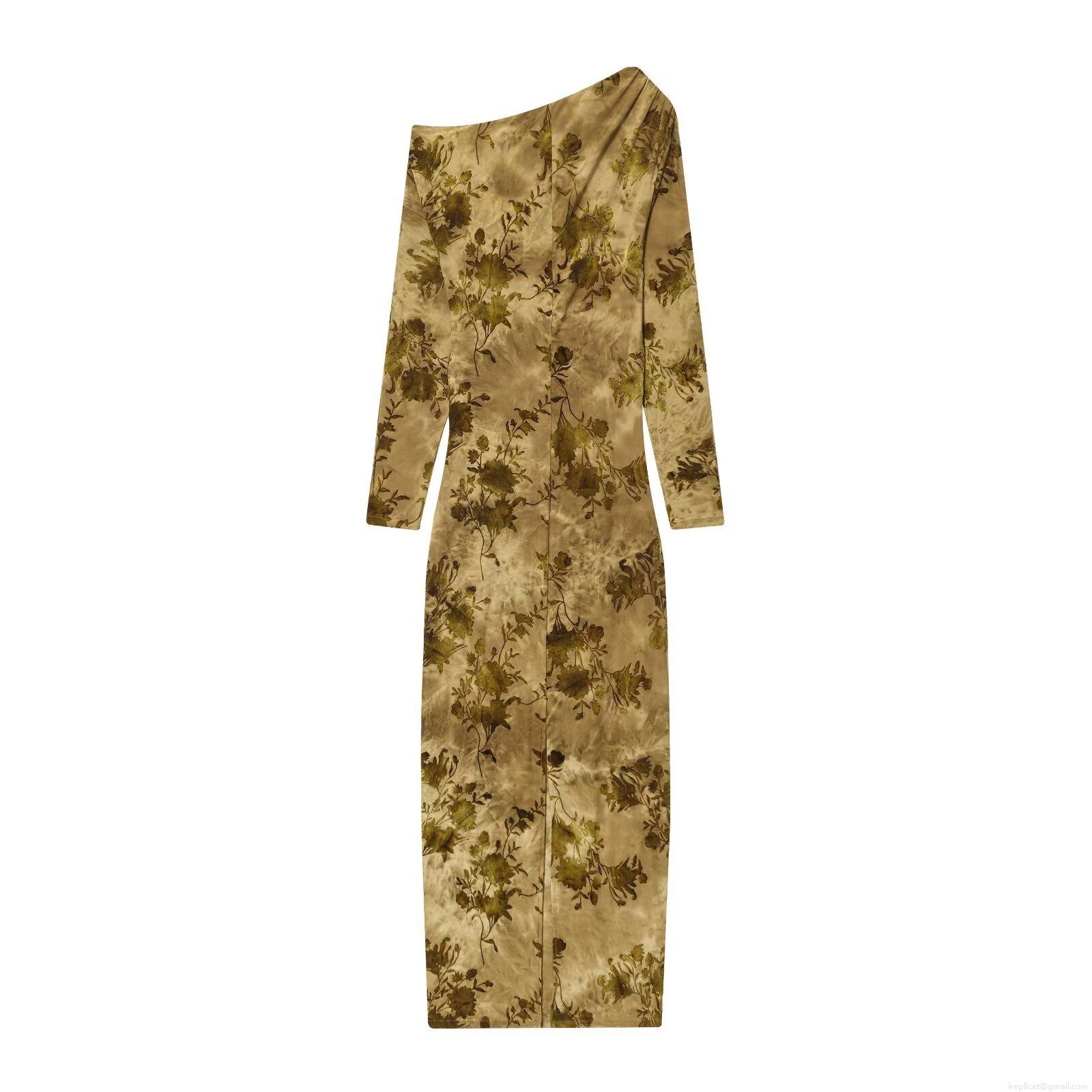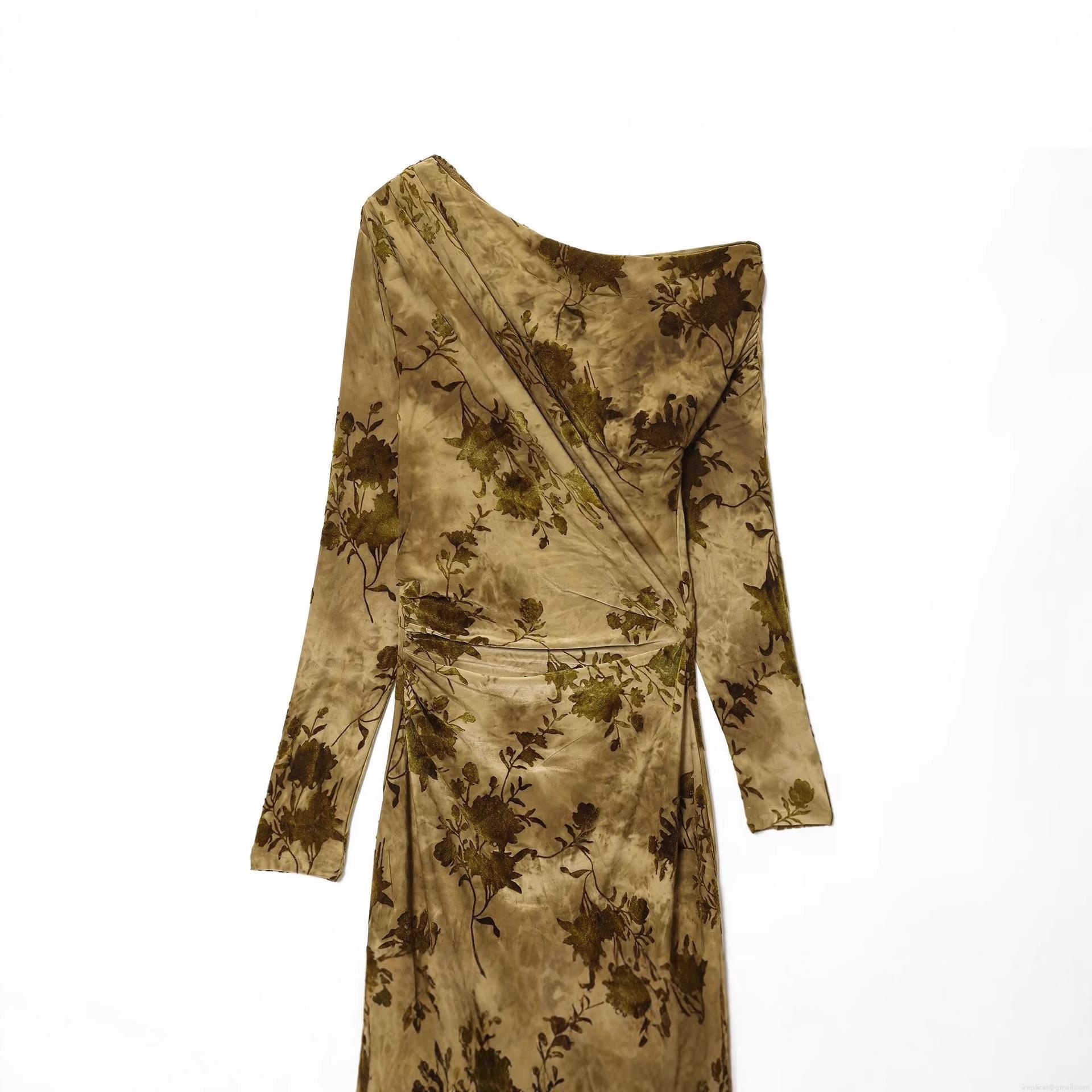 • Women's Elegant One Shoulder Maxi Dress Retro Floral Burnout Velvet Flocking Pleated Bodycon Dress For Banquet Party Wedding