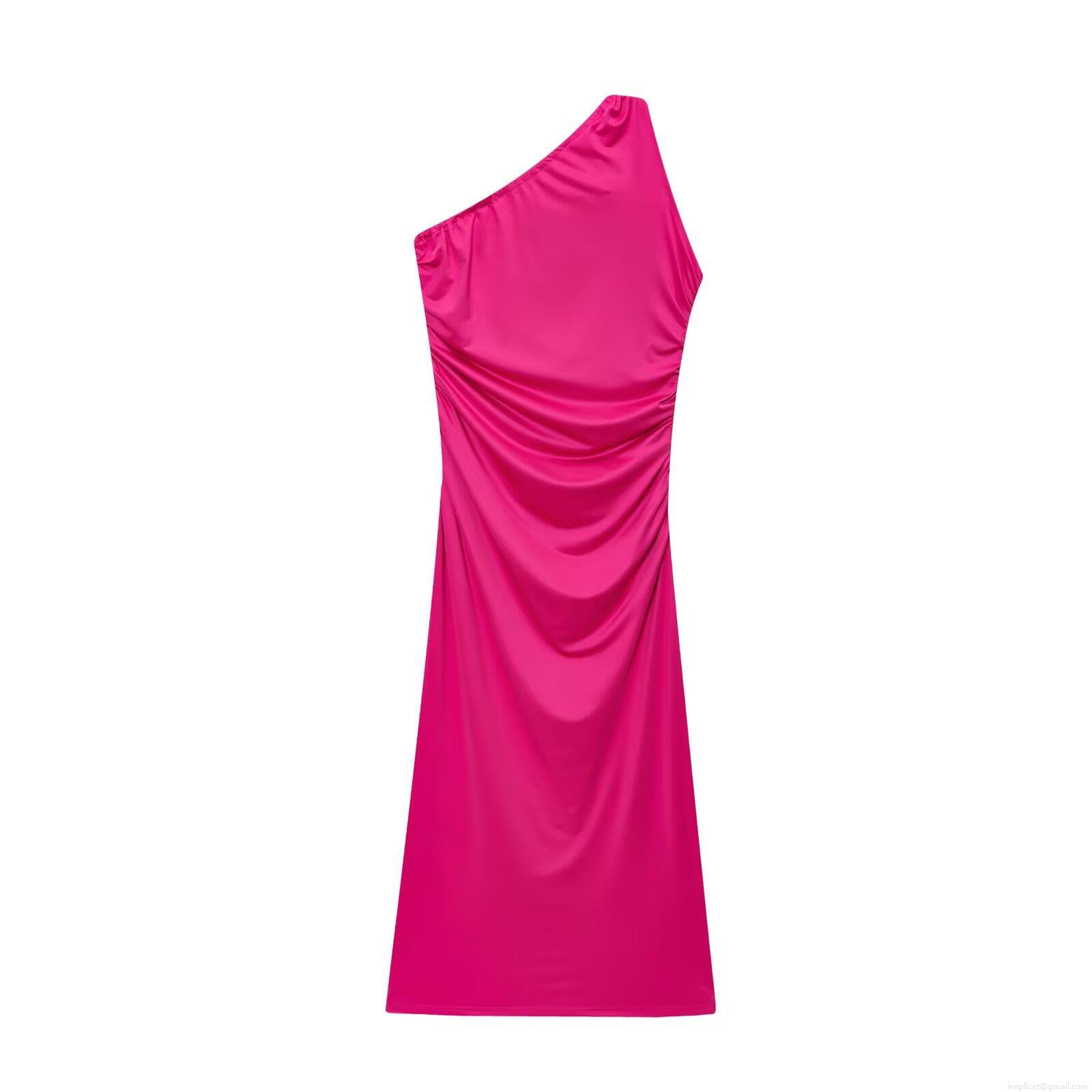 • Women's Elegant One Shoulder Maxi Dress Sexy Ruched Side Bodycon Evening Party Dress With Gold Metal Buckle Asymmetrical Fuchsia Satin Finish Cocktail Banquet Gown