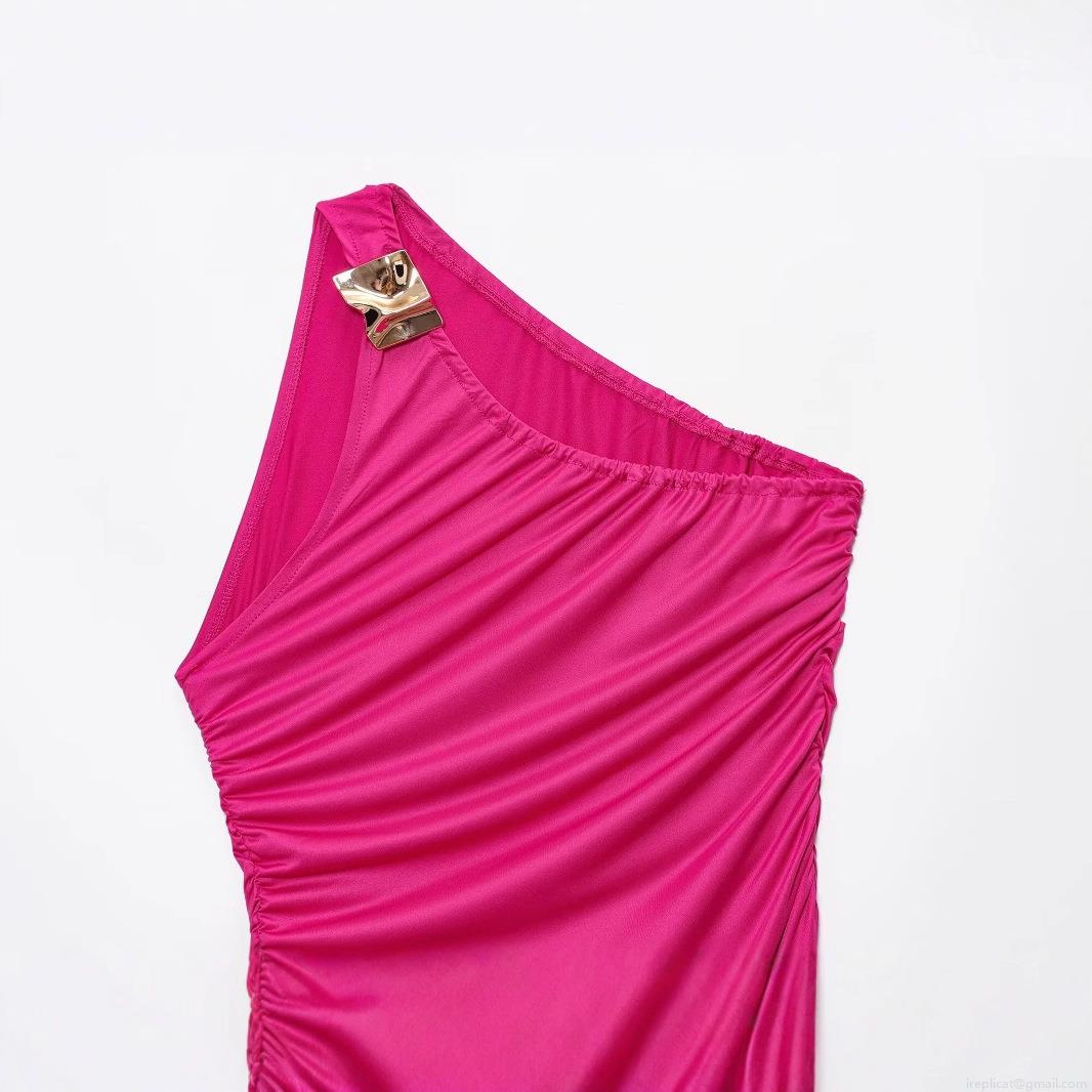 Solid Color, One Shoulder, Asymmetric, Pleats, Metal Decoration