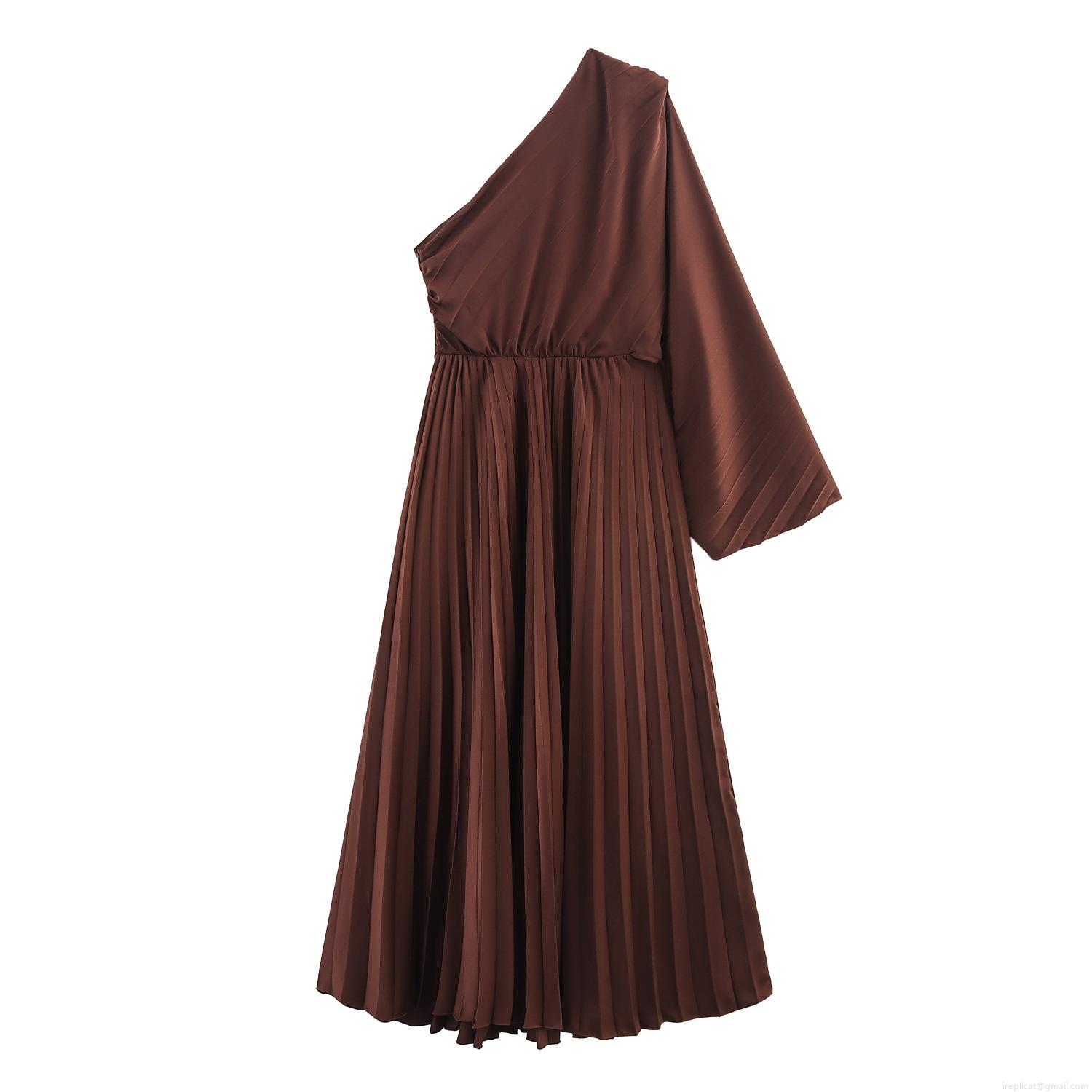 Women's Elegant One-Shoulder Pleated Maxi Dress Asymmetric Long Sleeve High Waist Party Dress Deep Brown Solid Color Polyester Metal Buckle