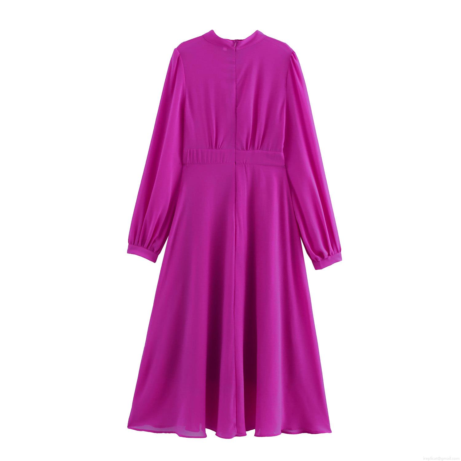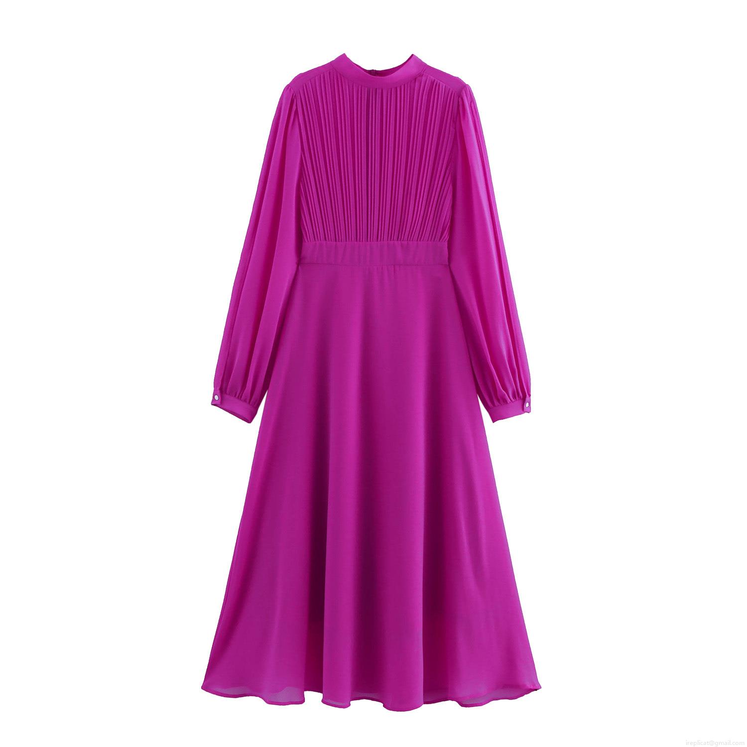 • Women's Elegant Pleated Mock Neck Long Sleeve Maxi Dress Solid Color High Waist A-Line Polyester Chiffon Textured Dress for Party Evening Casual