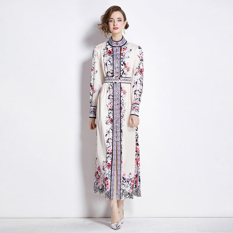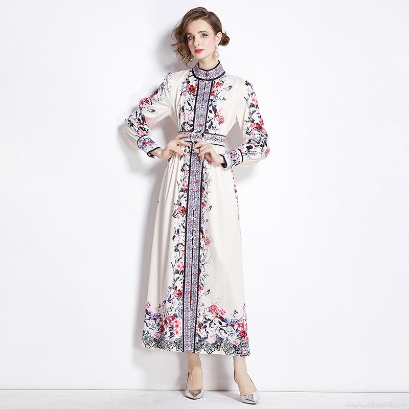 • Women's Elegant Retro Floral Print Maxi Dress Long Sleeve Stand Collar Single Breasted With Belt Polyester Swing Party Dress
