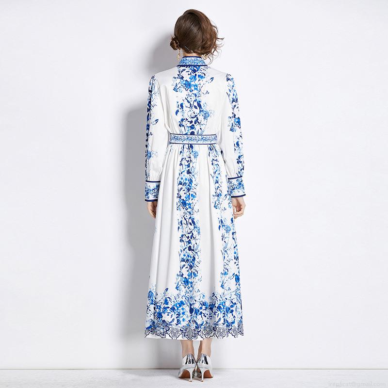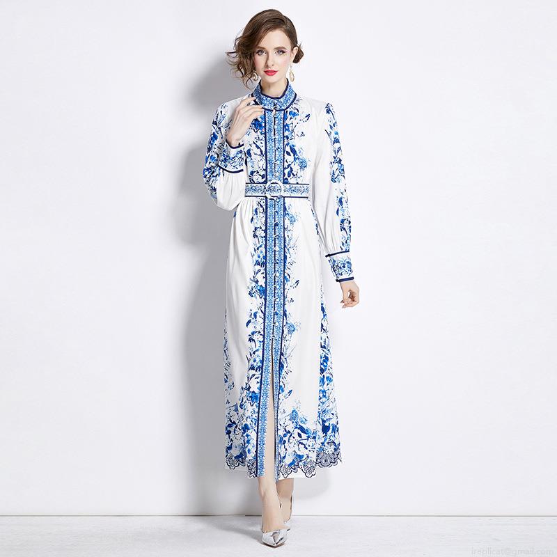 Splice, Printing, Retro Floral, Stand-up Collar, Puff Sleeves, Lace, Single-breasted, Blue And White Porcelain Style, Matching Belt