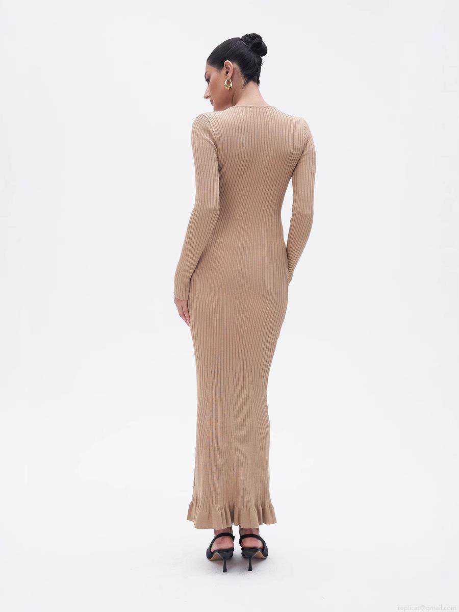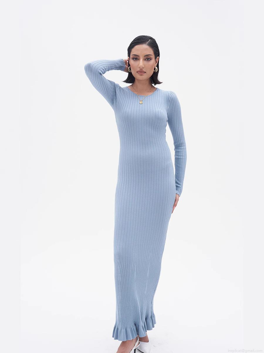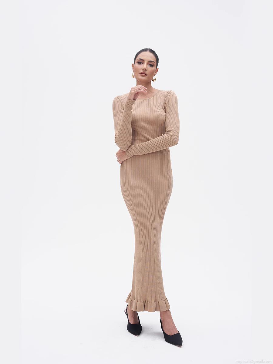 • Women's Elegant Ribbed Knit Maxi Dress Crew Neck Long Sleeve Bodycon Mermaid Hem Ruffle Long Dress For Spring Autumn Street Fashion