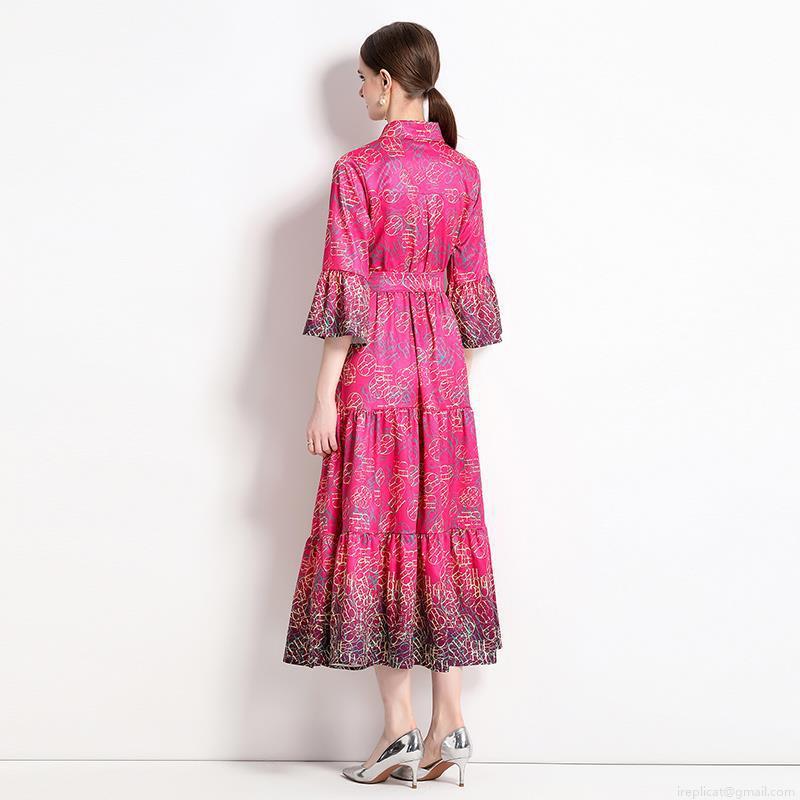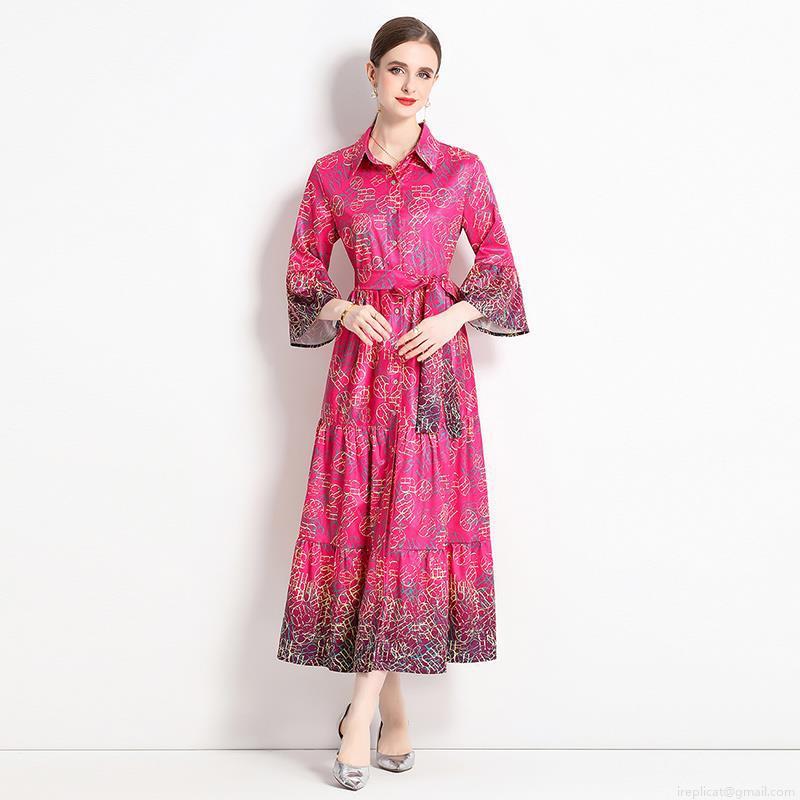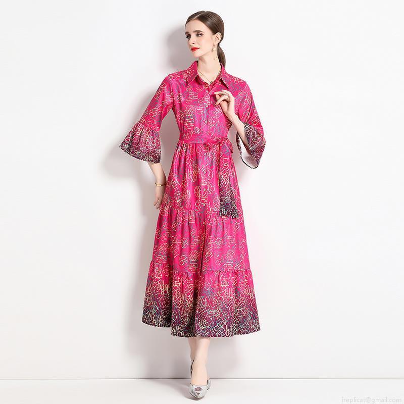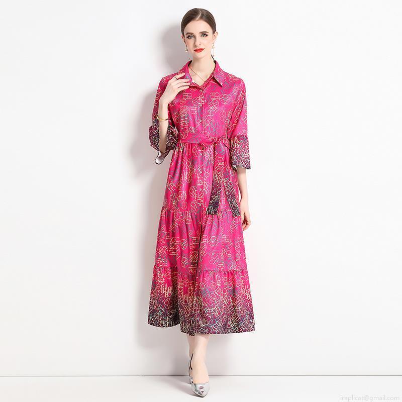 • Women's Elegant Rose Red Letter Print Shirt Maxi Dress Belted Trumpet Sleeve Tiered Skirt Polyester Satin Textured Evening Party Commuter Dress