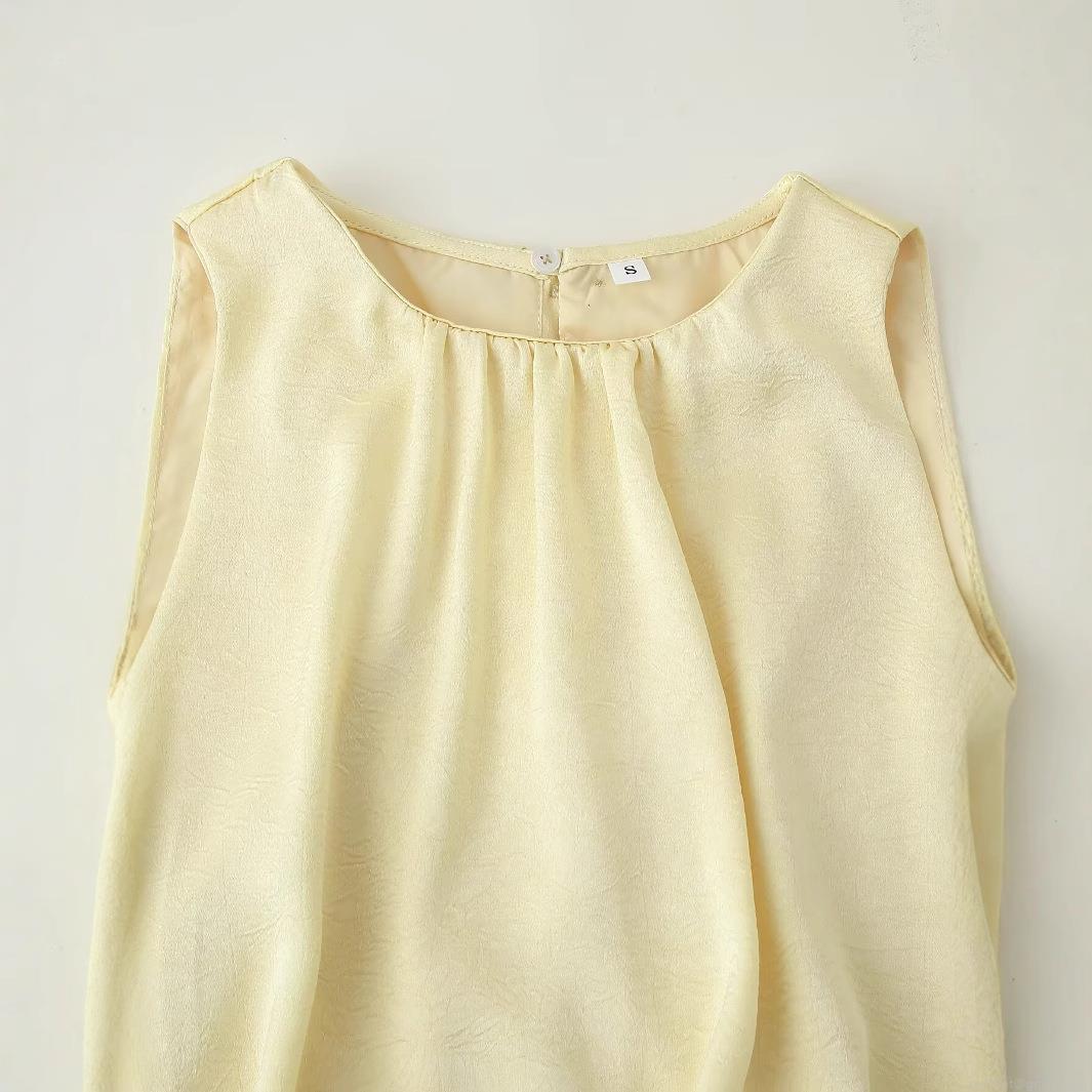 • Women's Elegant Round Neck Sleeveless Maxi Dress 100% Polyester Satin Texture Ruched Pleated High Slit Slim Fit Solid Cream Yellow Long Dress For Party Dating Summer
