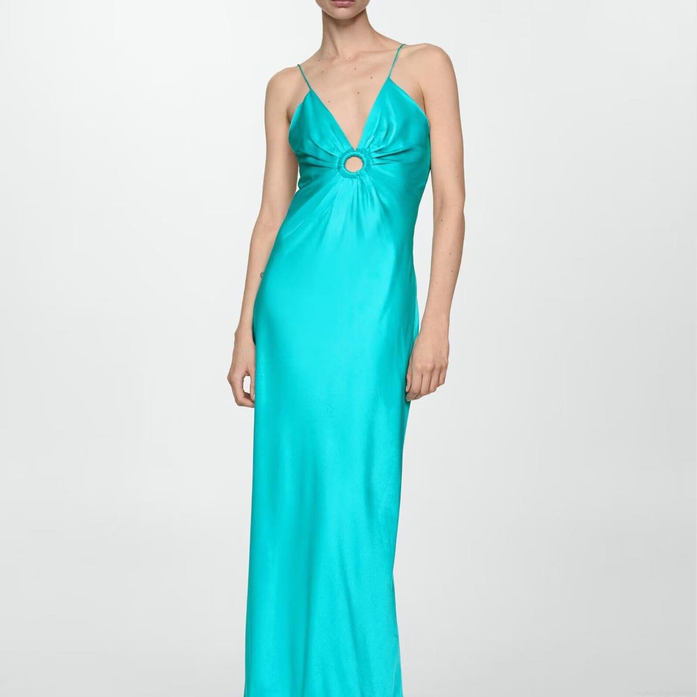 • Women's Elegant Satin Maxi Dress Sexy Deep V-Neck Hollow Out Metal O-Ring Detail Spaghetti Strap Slim Fit Long Evening Party Dress Polyester Lake Blue