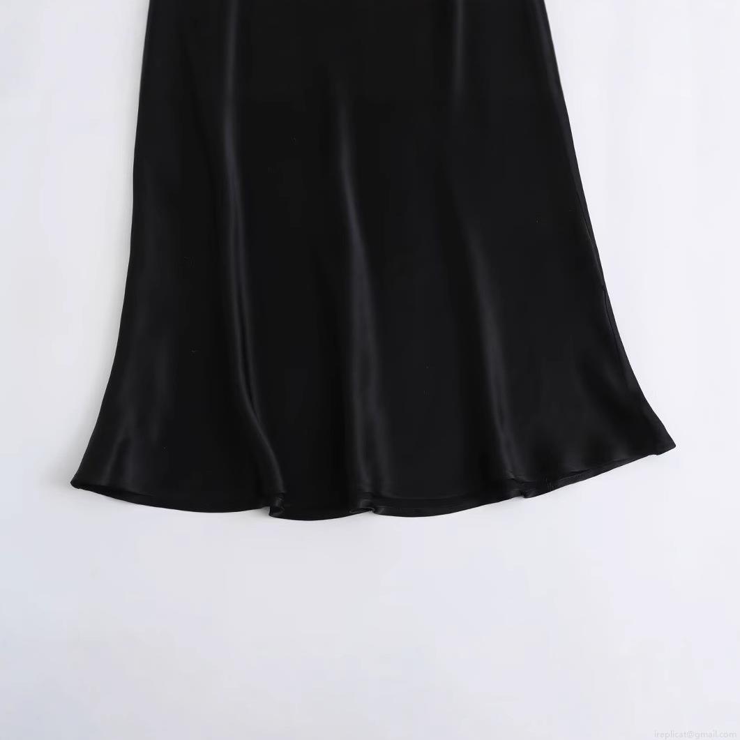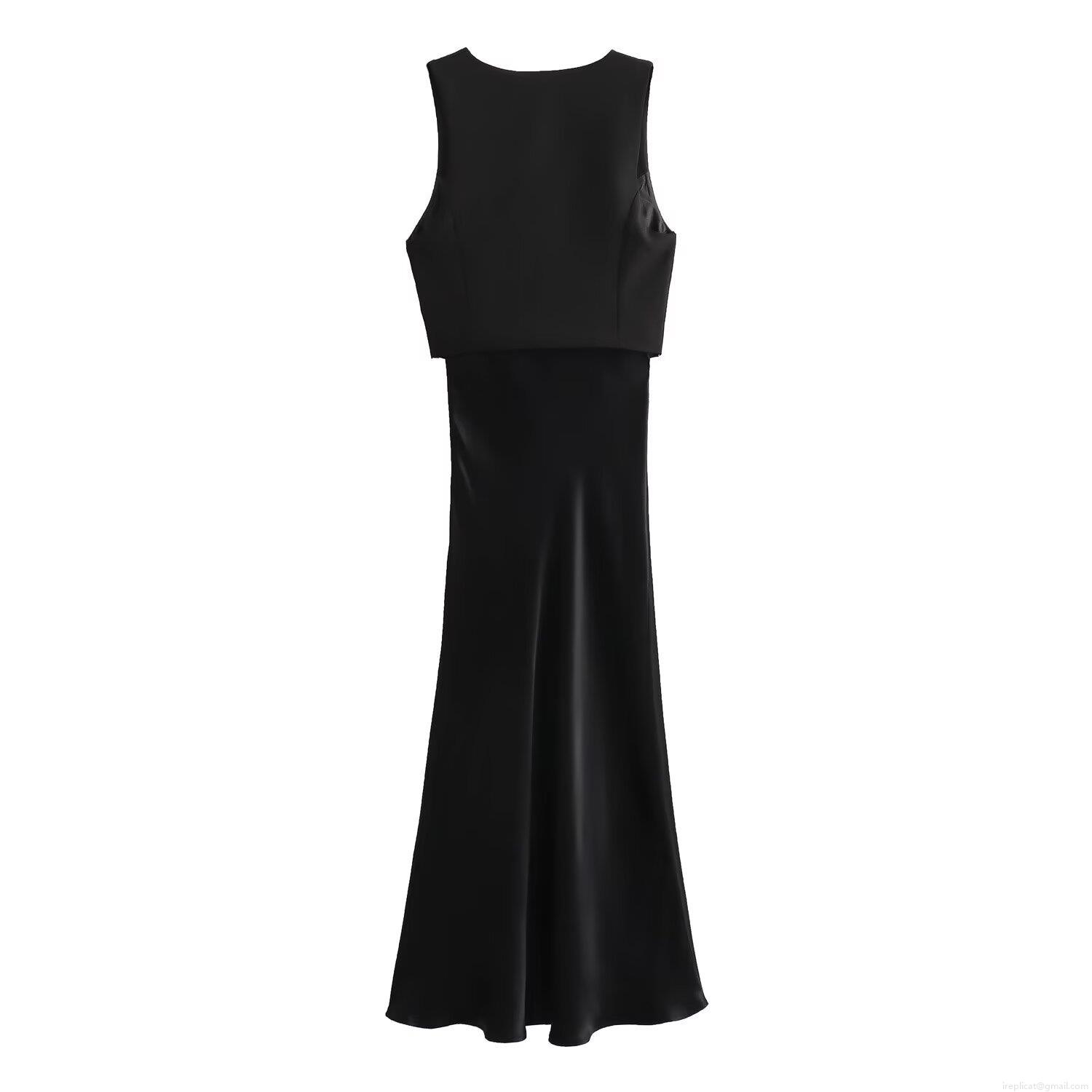 • Women's Elegant Satin Patchwork Vest Maxi Dress V-Neck Sleeveless Fake Two-Piece Long Dress For Party Evening Socialite Style Black