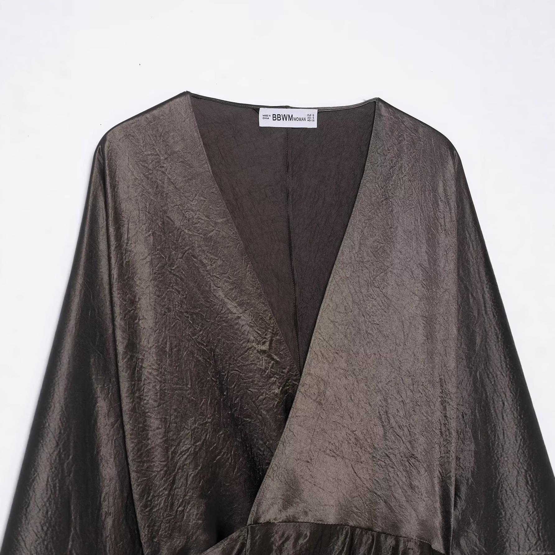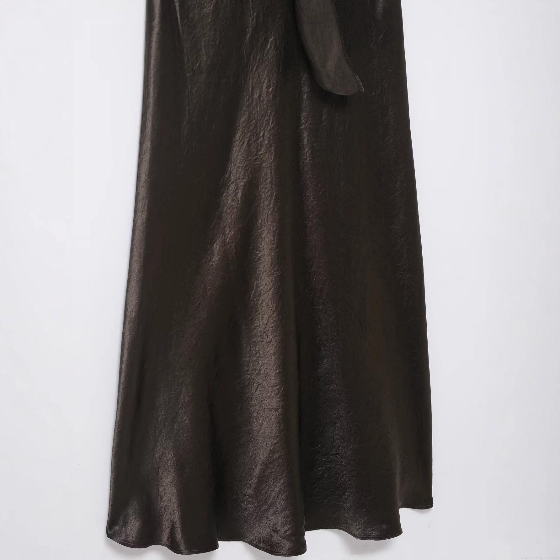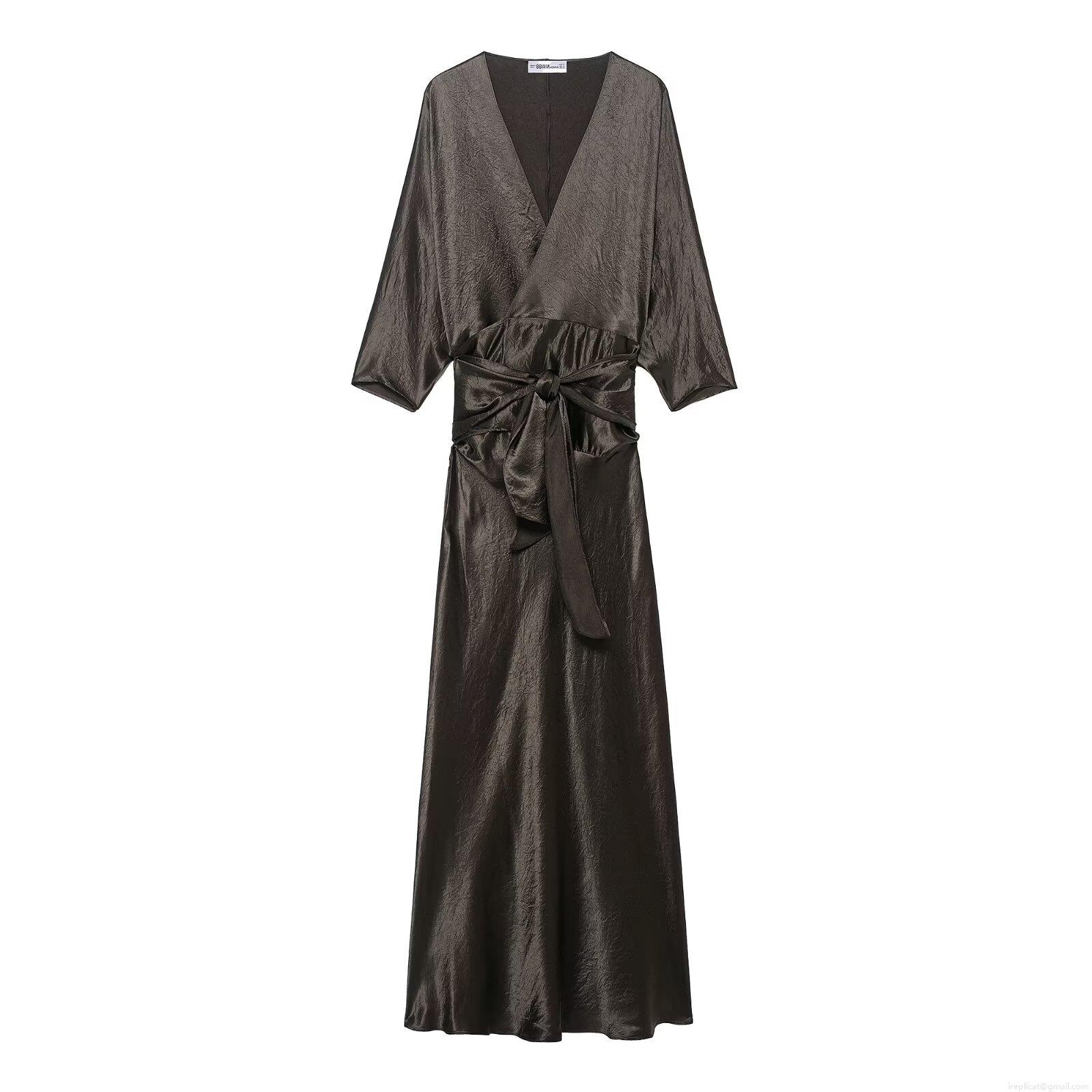 • Women's Elegant Satin Texture V-Neck Maxi Dress Pleated Texture Long Sleeve Tie Waist Deep V Neck High Gloss Party Evening Gown For Ladies Silk Like Dress