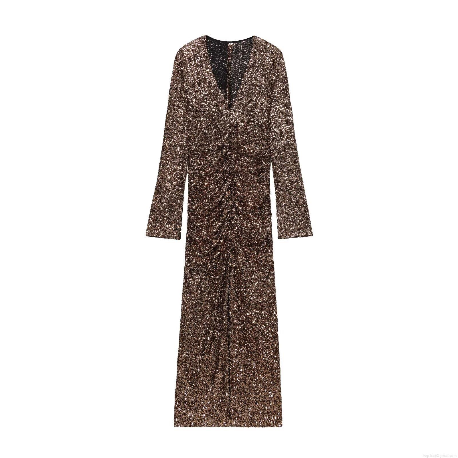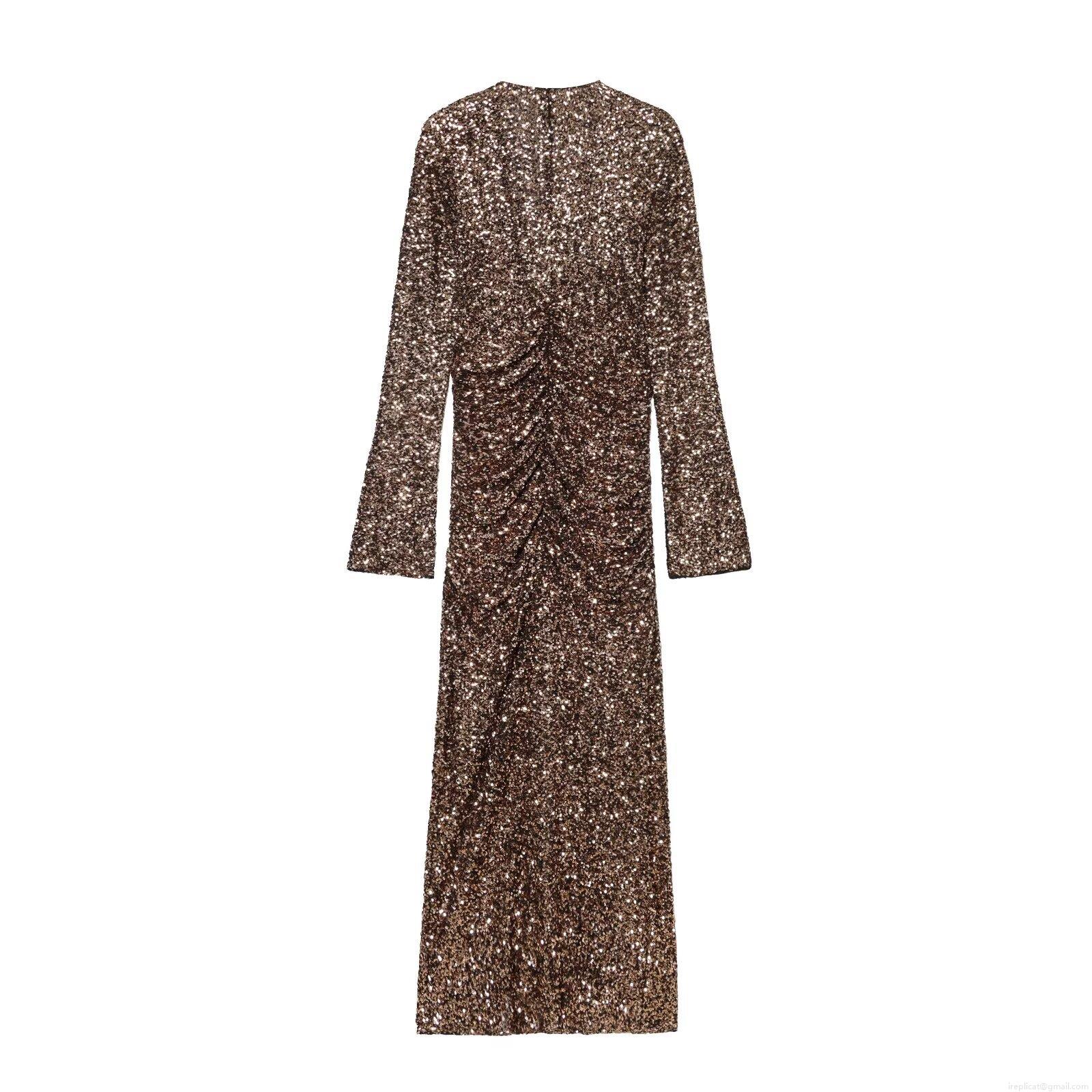 • Women's Elegant Sequin V-Neck Long Sleeve Maxi Dress With Shoulder Pads Ruched High Slit Formal Evening Party Banquet Gown Sparkly Bodycon Style