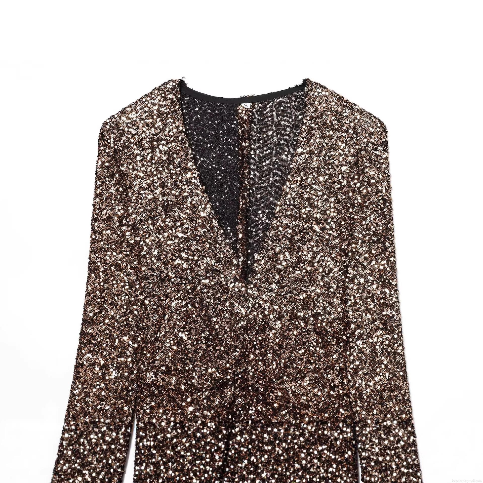 Solid Color, Waist shaping, V-neck, Gathering, Shoulder Pads, Sequin Decoration
