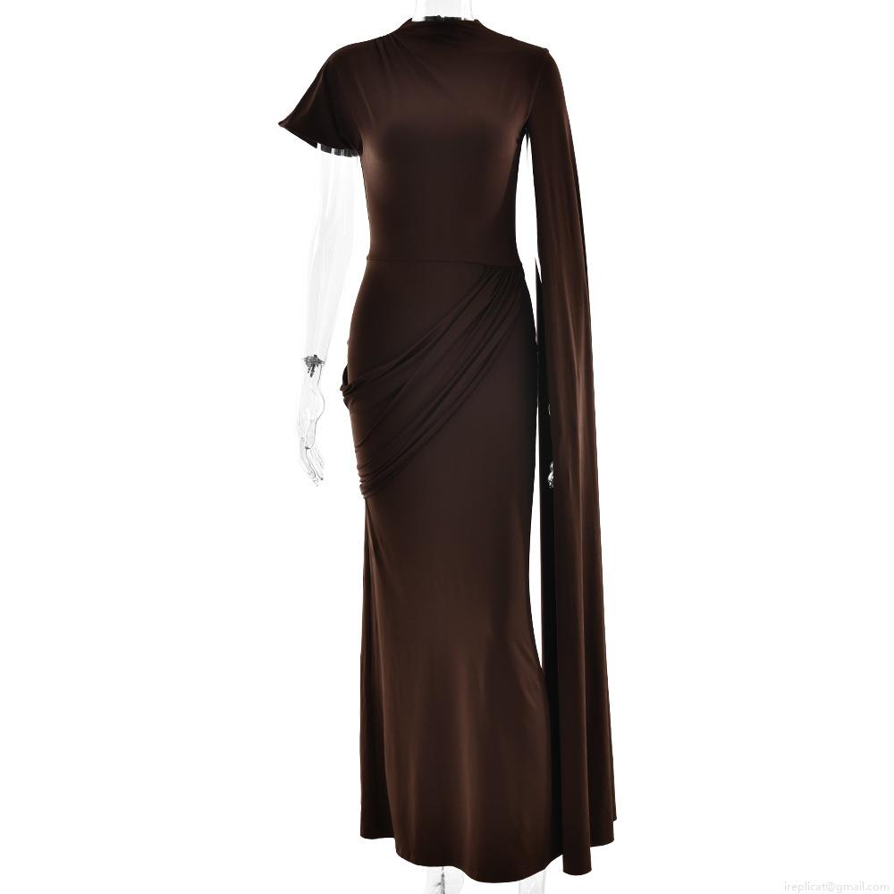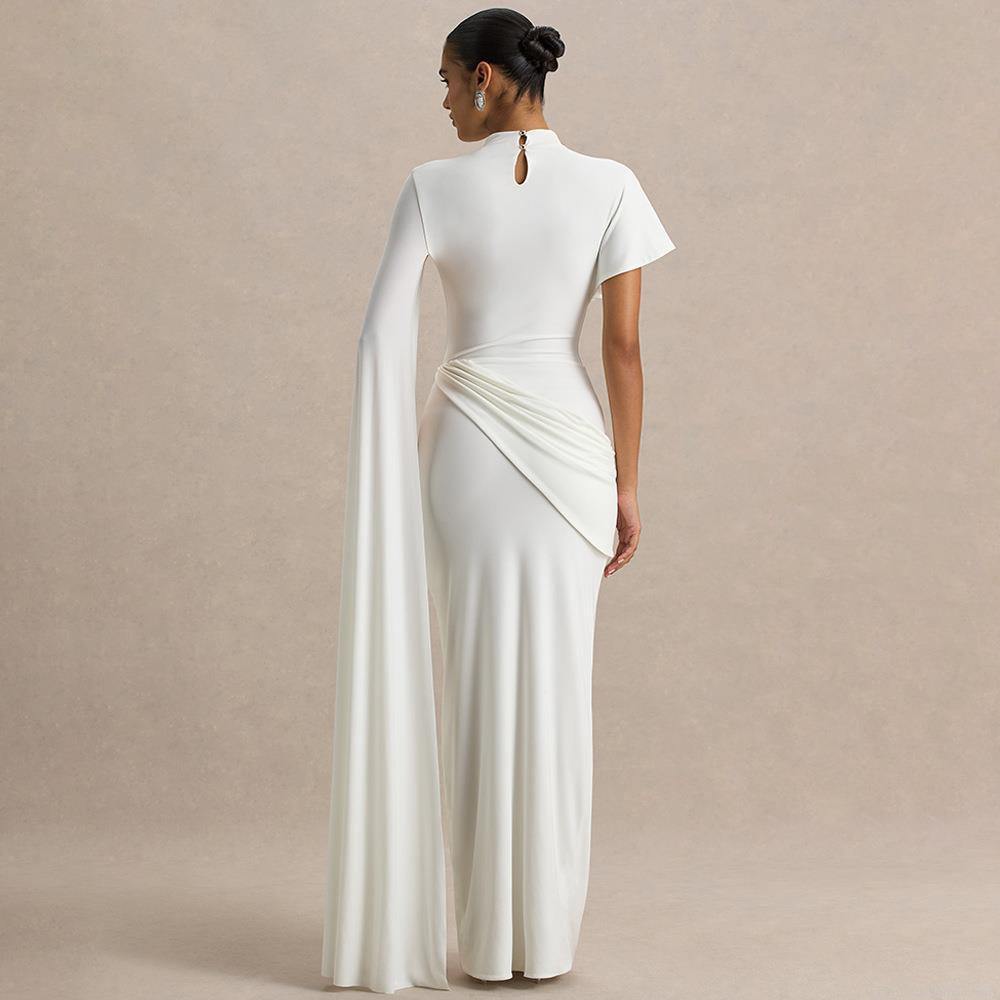 Women's Elegant Sexy Asymmetric Cape Sleeve Maxi Dress Milk Silk Polyester Pleated Slim Fit Evening Banquet Party Gown For Ladies