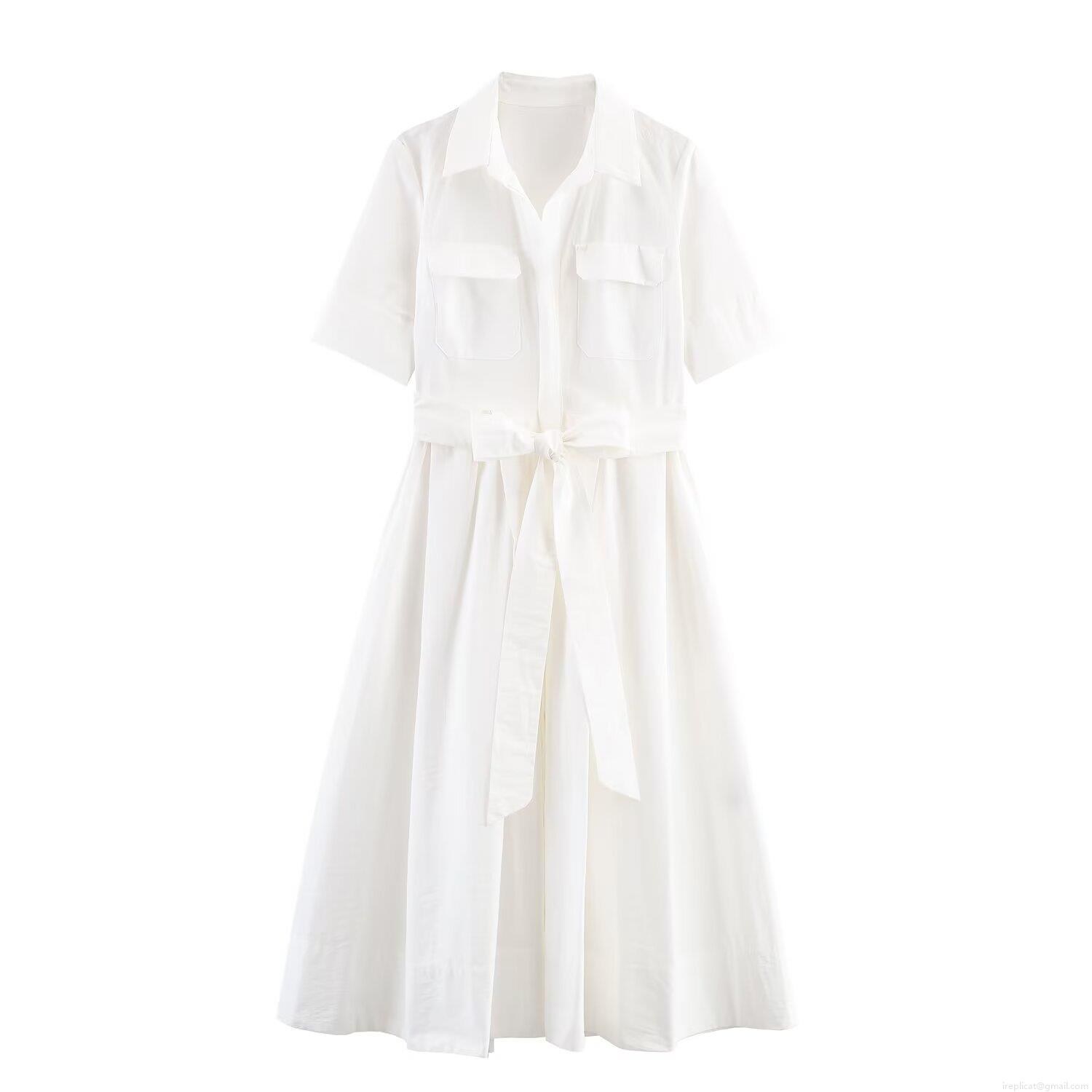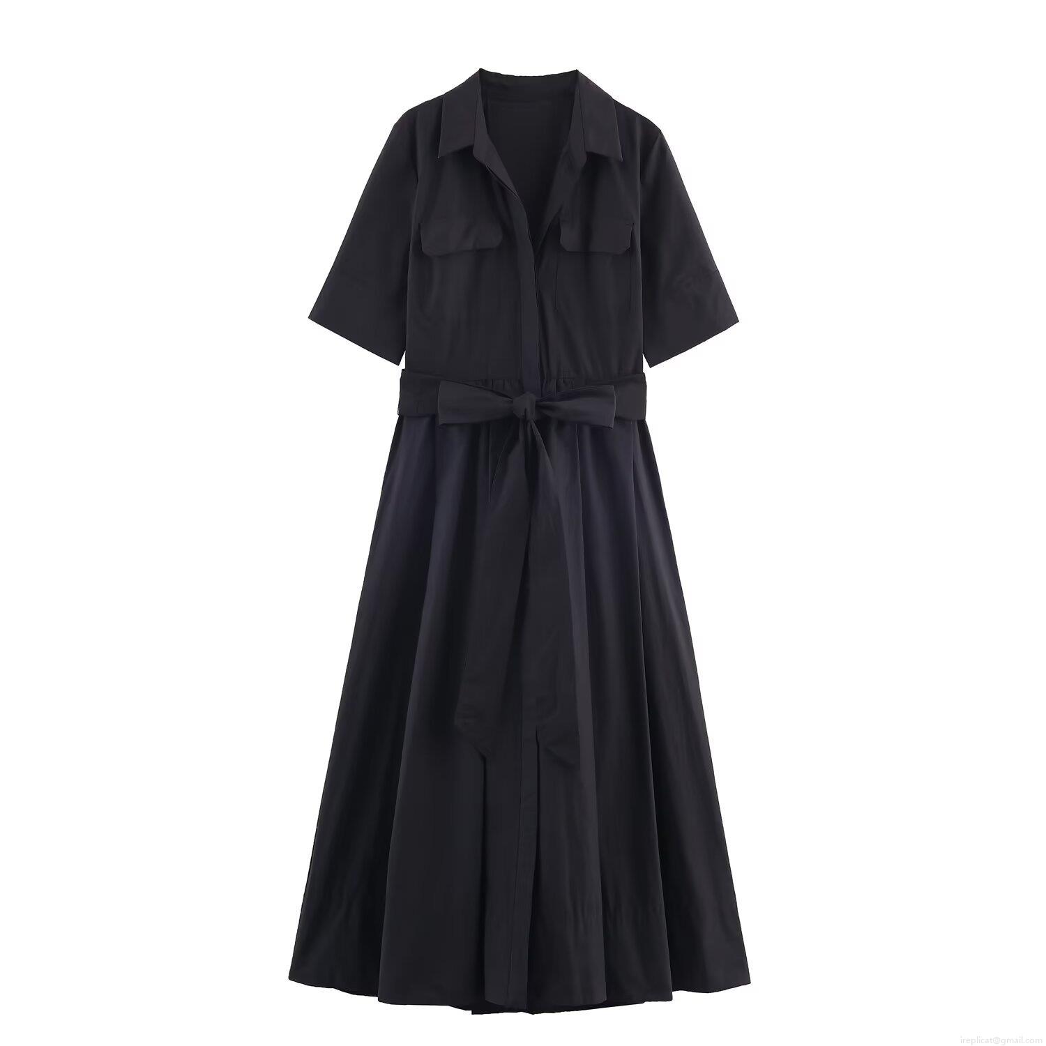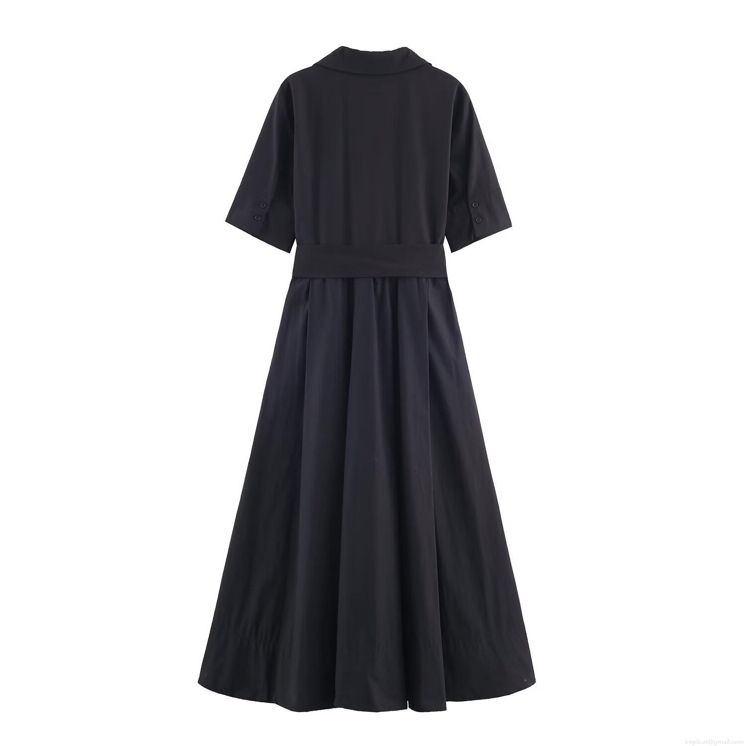 Women's Elegant Short Sleeve Poplin Shirt Dress With Sash Belt And Pockets Solid Color High Waist Maxi Dress Casual Summer Midi Dresses