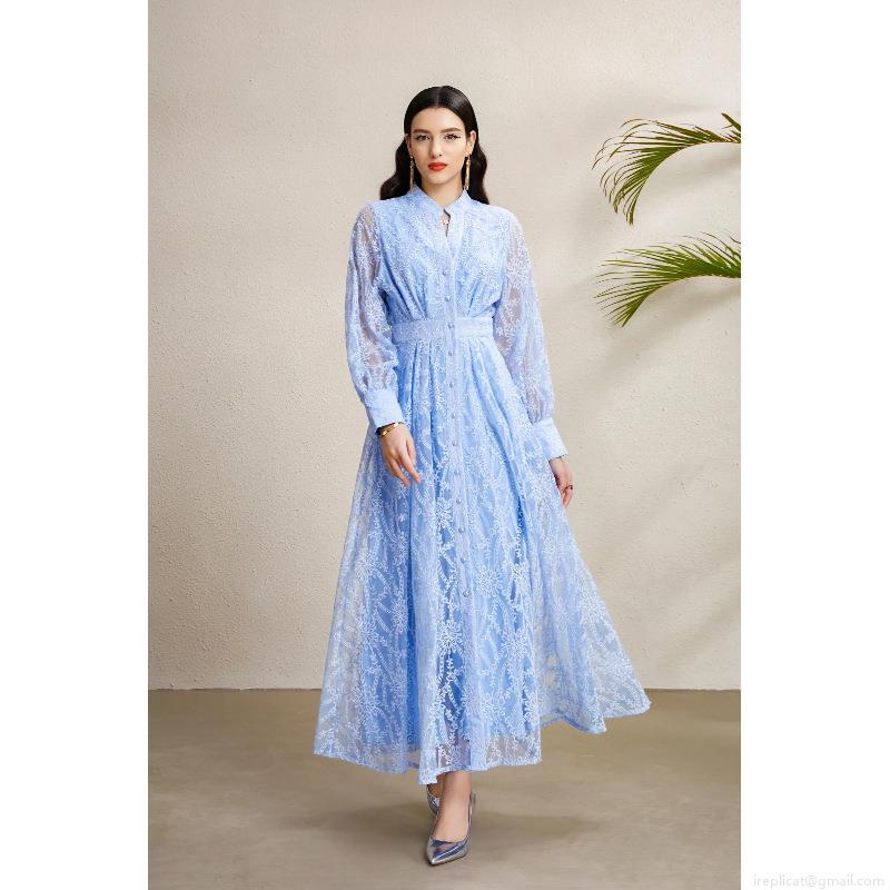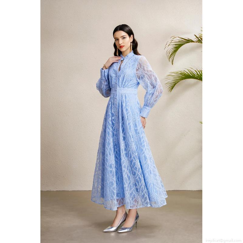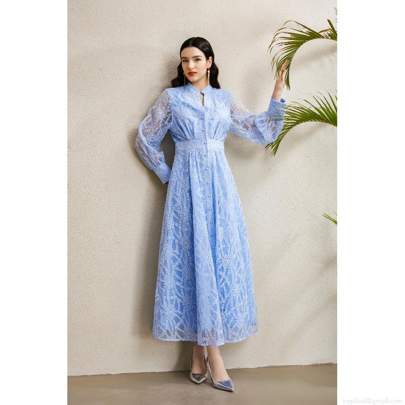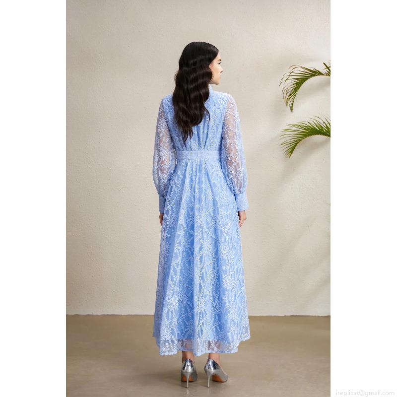 • Women's Elegant Sky Blue Lace Embroidery Maxi Dress Long Sleeve V-Neck Palace Style Lantern Sleeve Pleated A-Line Party Dress For Formal Social Wedding Spring Autumn