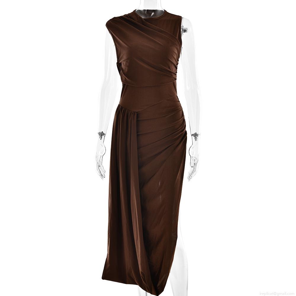 • Women's Elegant Sleeveless Round Neck Ruched Maxi Dress Solid Color Irregular Split Satin Elastic Bodycon Long Dress For Party Club Evening