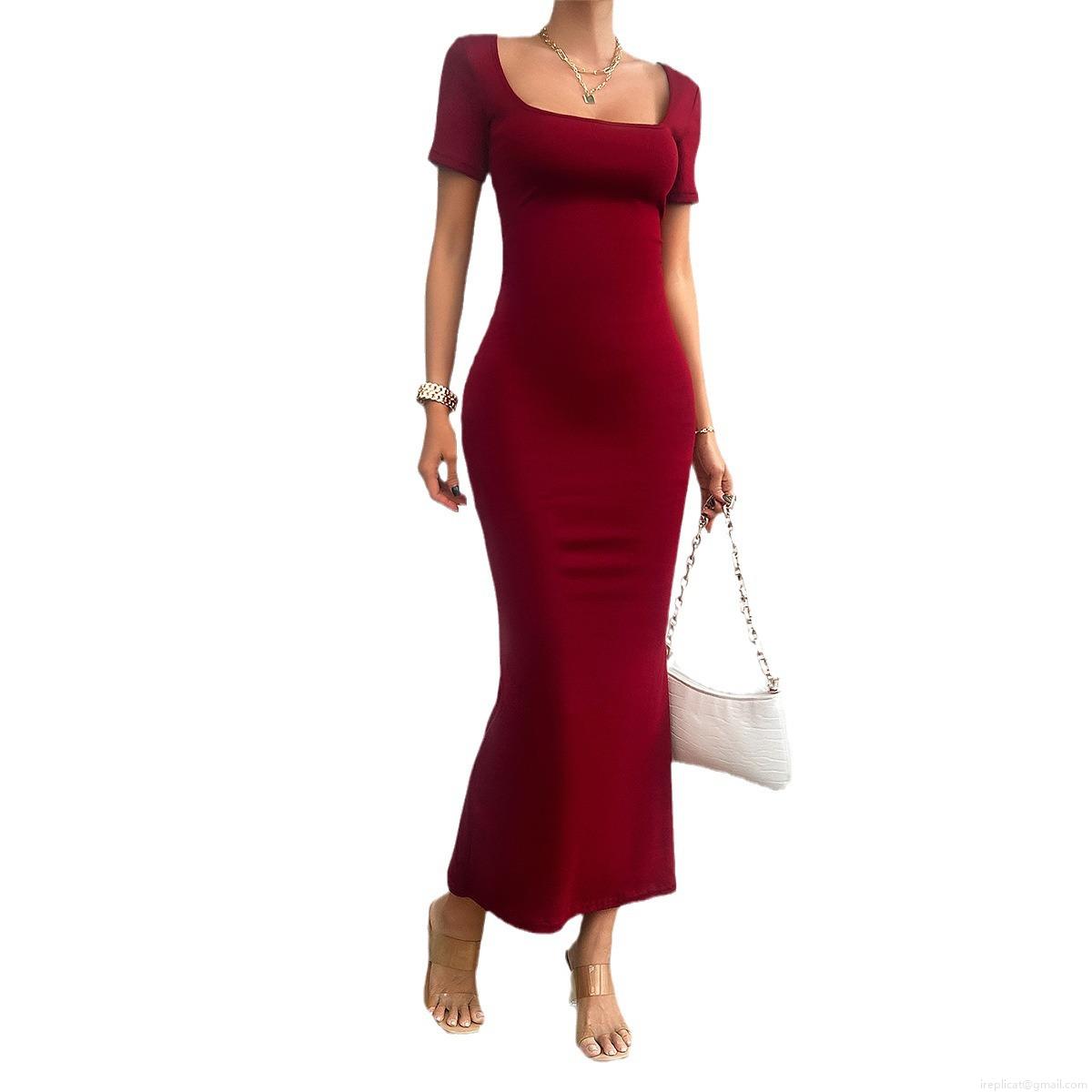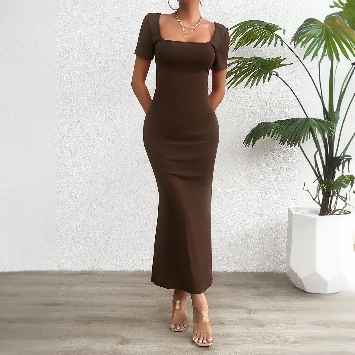 • Women's Elegant Slim Fit Maxi Dress Square Neck Short Sleeve Backless Lace-up Cutout Solid Color Cotton Blend Knitted Long Dress for Casual Party Dating
