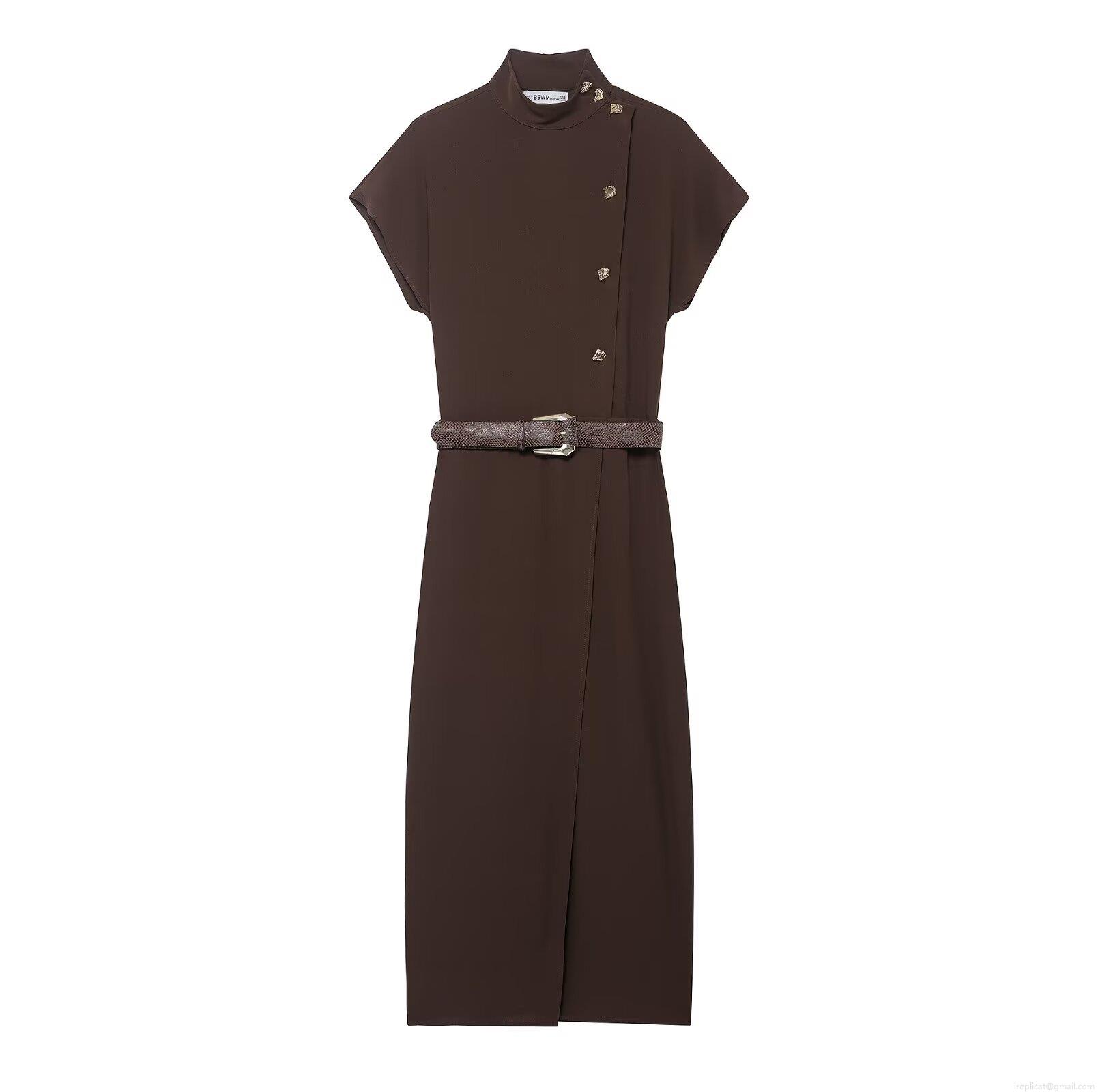 • Women's Elegant Solid Color Mock Neck Short Sleeve Maxi Dress With Snake Print Belt Asymmetrical Gold Buttons Polyester Commuter Straight Long Dress