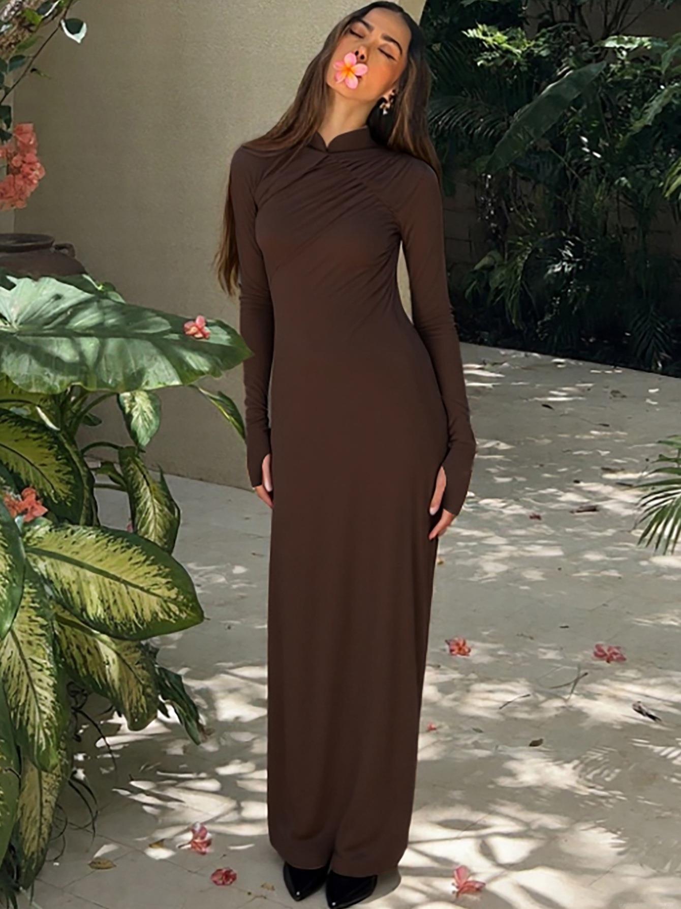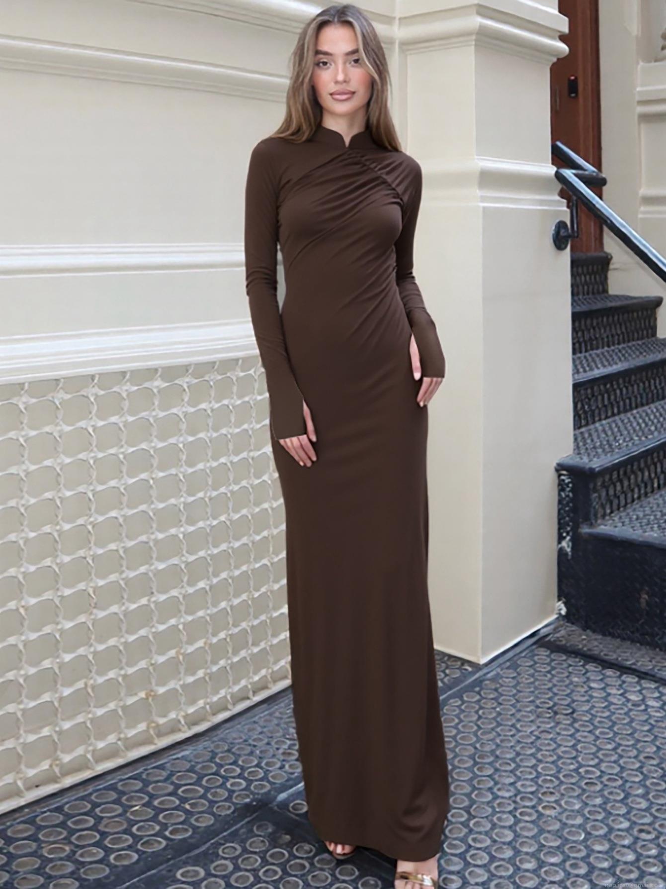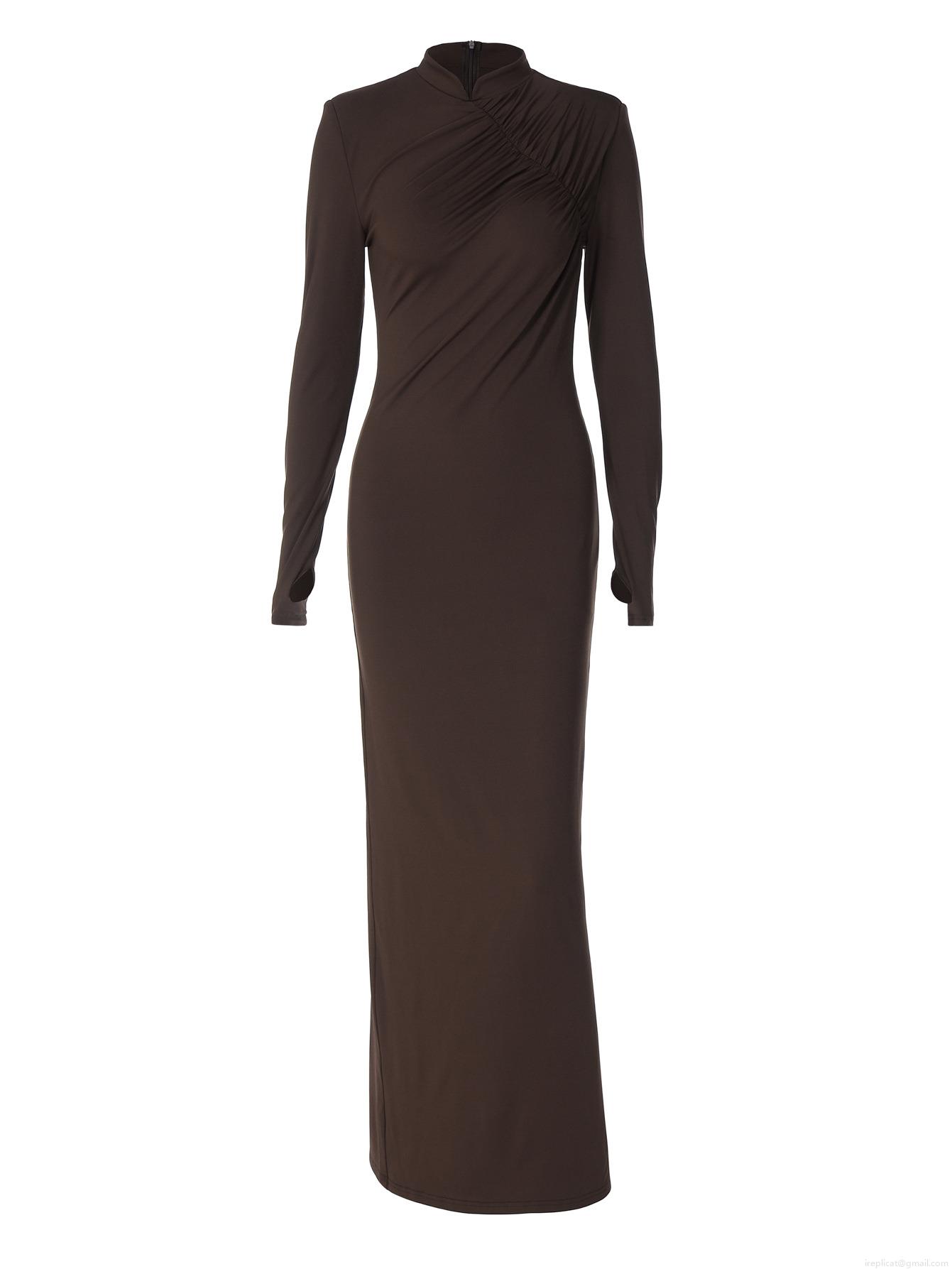 • Women's Elegant Solid Dark Brown Long Sleeve Maxi Bodycon Dress With Front Ruching And Back Slit Autumn Fashion Slim Fit Knitted Dress