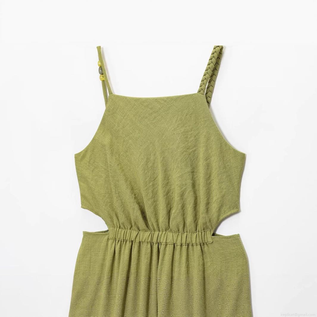 • Women's Elegant Solid Matcha Green Maxi Dress Halter Spaghetti Strap Waist Cutout Pleated Imitation Linen Dress For Summer Vacation Beach Party