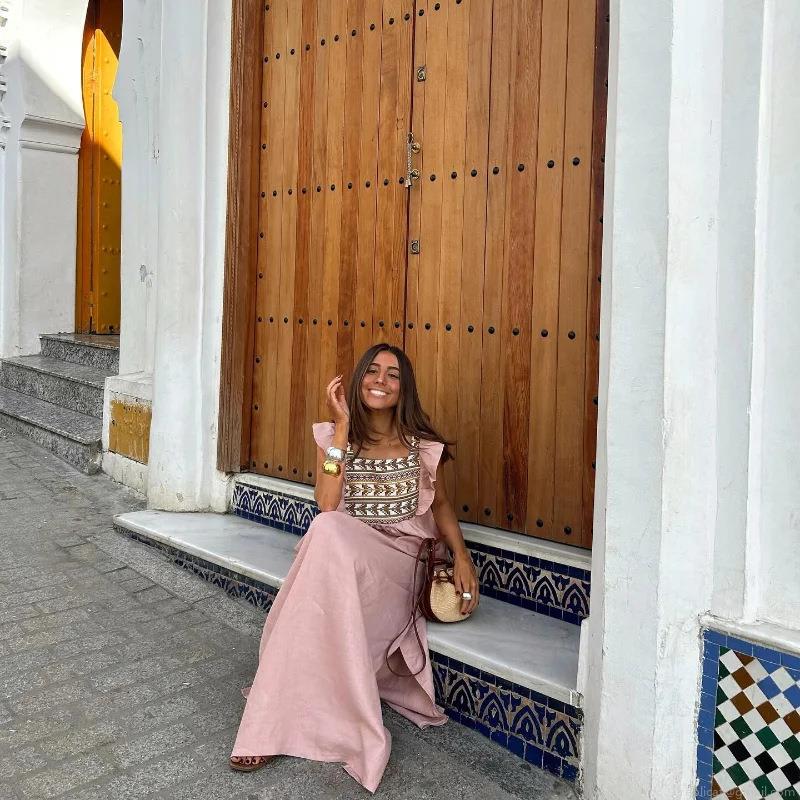 • Women's Elegant Square Neck Ruffle Sleeve Maxi Dress Ethnic Embroidered High Waist Side Split Long Dress Polyester Cotton Linen For Summer Vacation