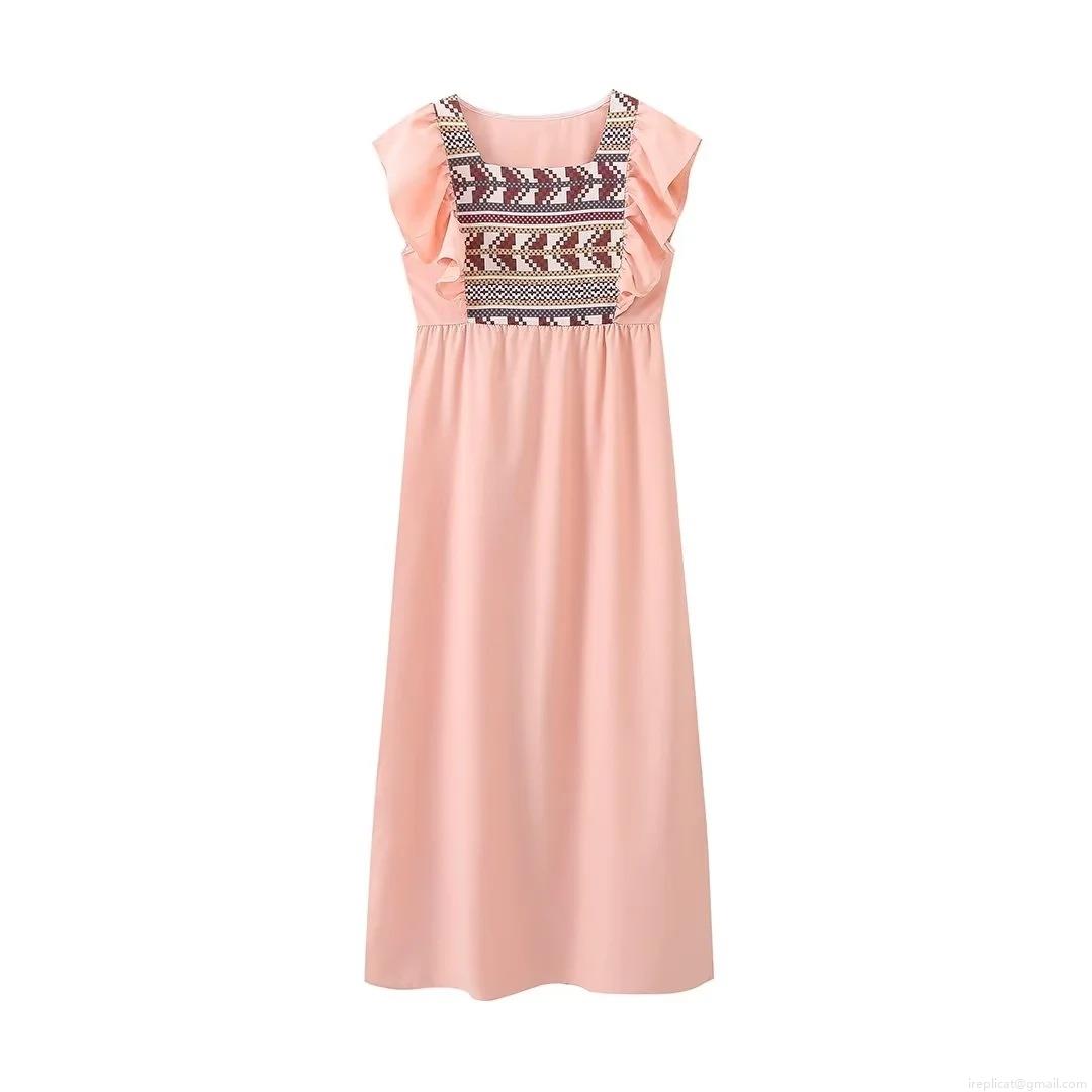Embroidery, Printing, Side Fork, High-waisted, Square Collar, Ruffled Sleeves, Ethnic Style Geometric Embroidery