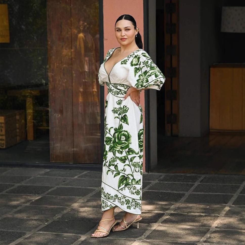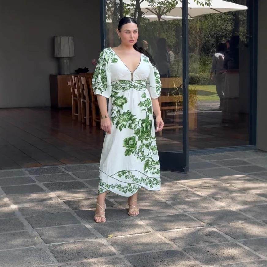 Women's Elegant V Neck Floral Print Maxi Dress Puff Sleeve Vacation Style A-Line Long Dress For Summer Casual Party White and Green