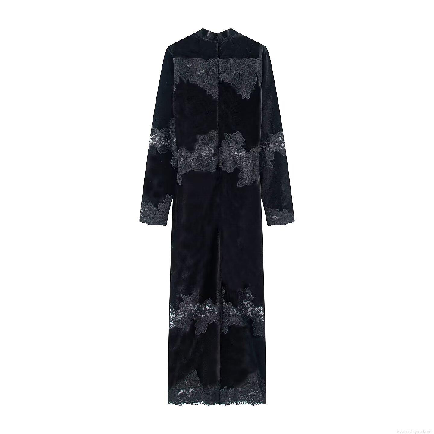 Women's Elegant Velvet Lace Maxi Dress Retro Stand Collar Long Sleeve Bodycon Evening Gown For Wedding Party Black Vintage Sexy Dresses