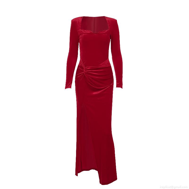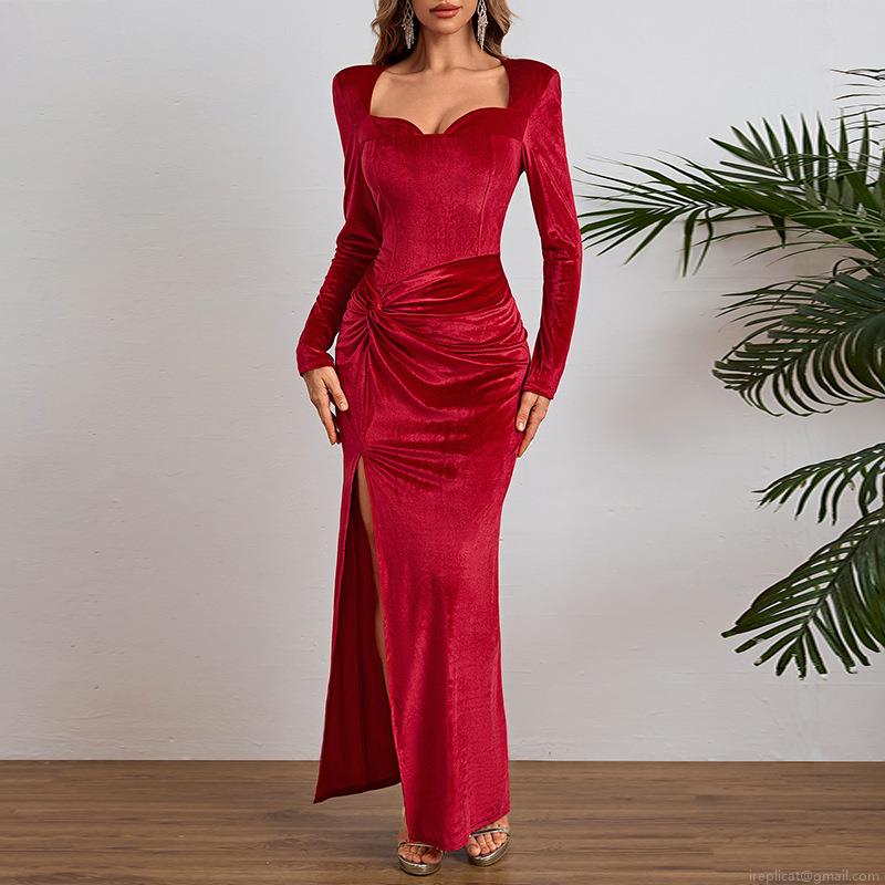 • Women's Elegant Velvet Maxi Dress Square Neck Long Sleeve Ruched High Slit Bodycon Formal Evening Party Wedding Guest Dress