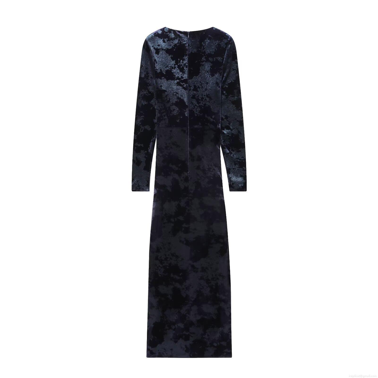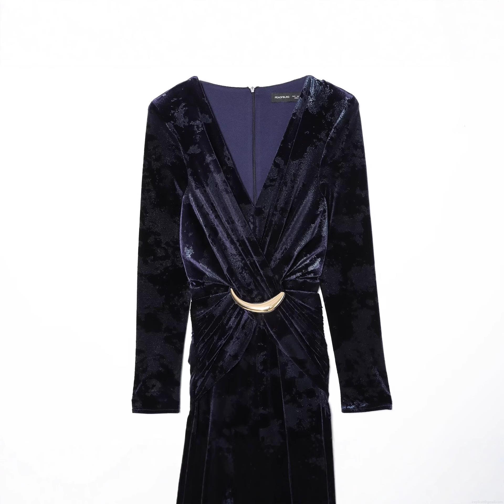 • Women's Elegant Velvet V-Neck Long Sleeve Maxi Dress Vintage Slim Fit Evening Party Gown With Gold Crescent Buckle