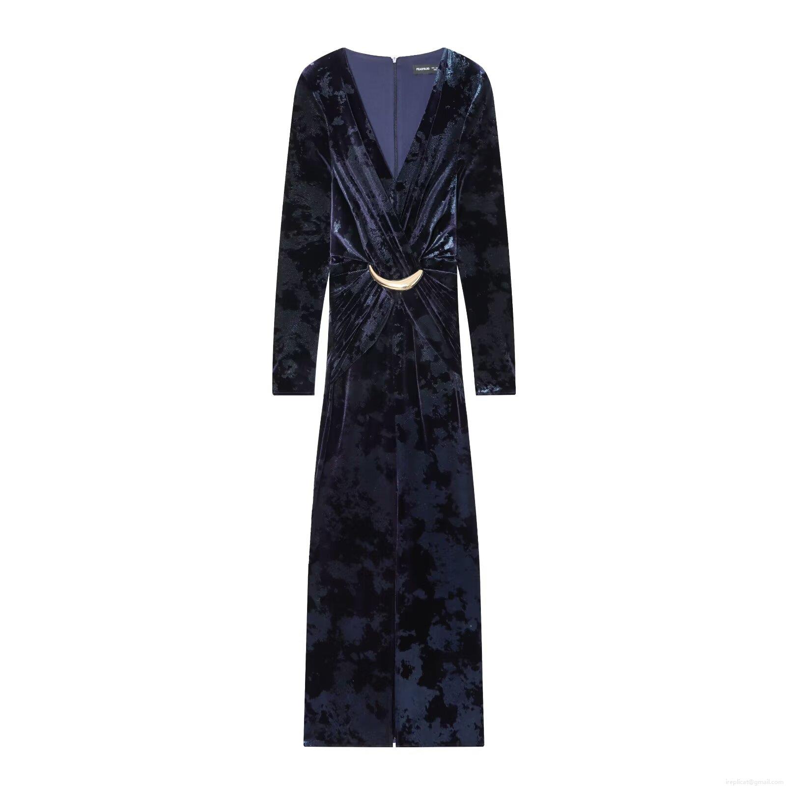 Women's Elegant Velvet V-Neck Long Sleeve Maxi Dress Vintage Slim Fit Evening Party Gown With Gold Crescent Buckle