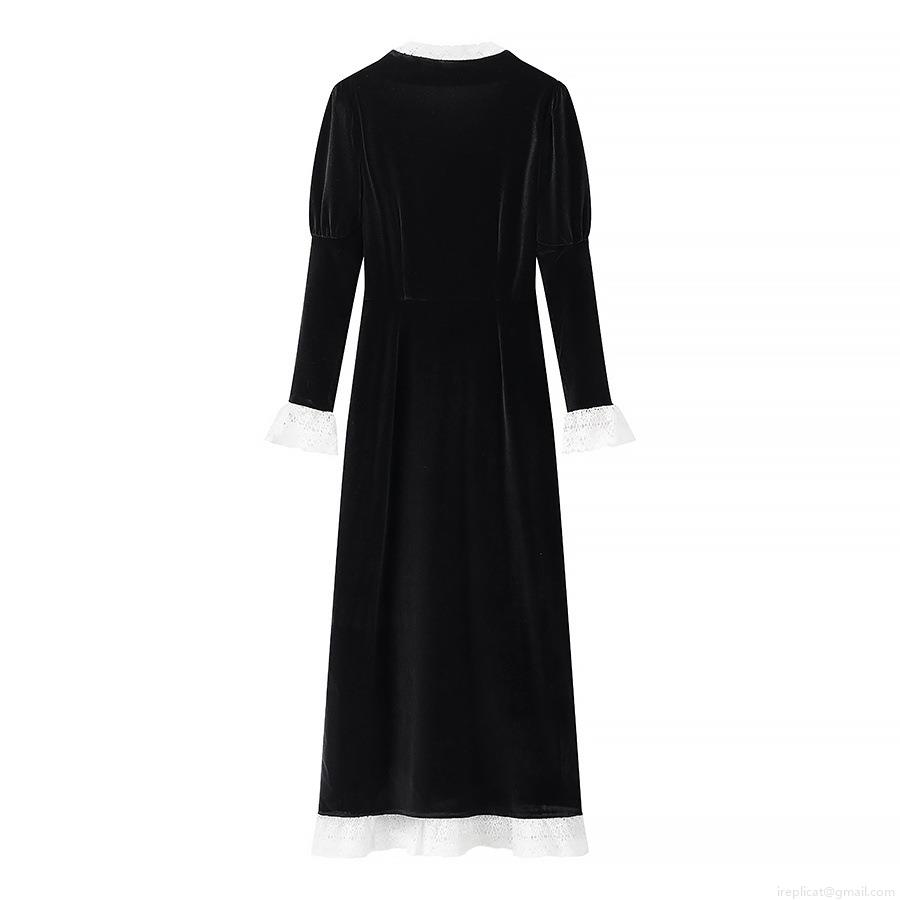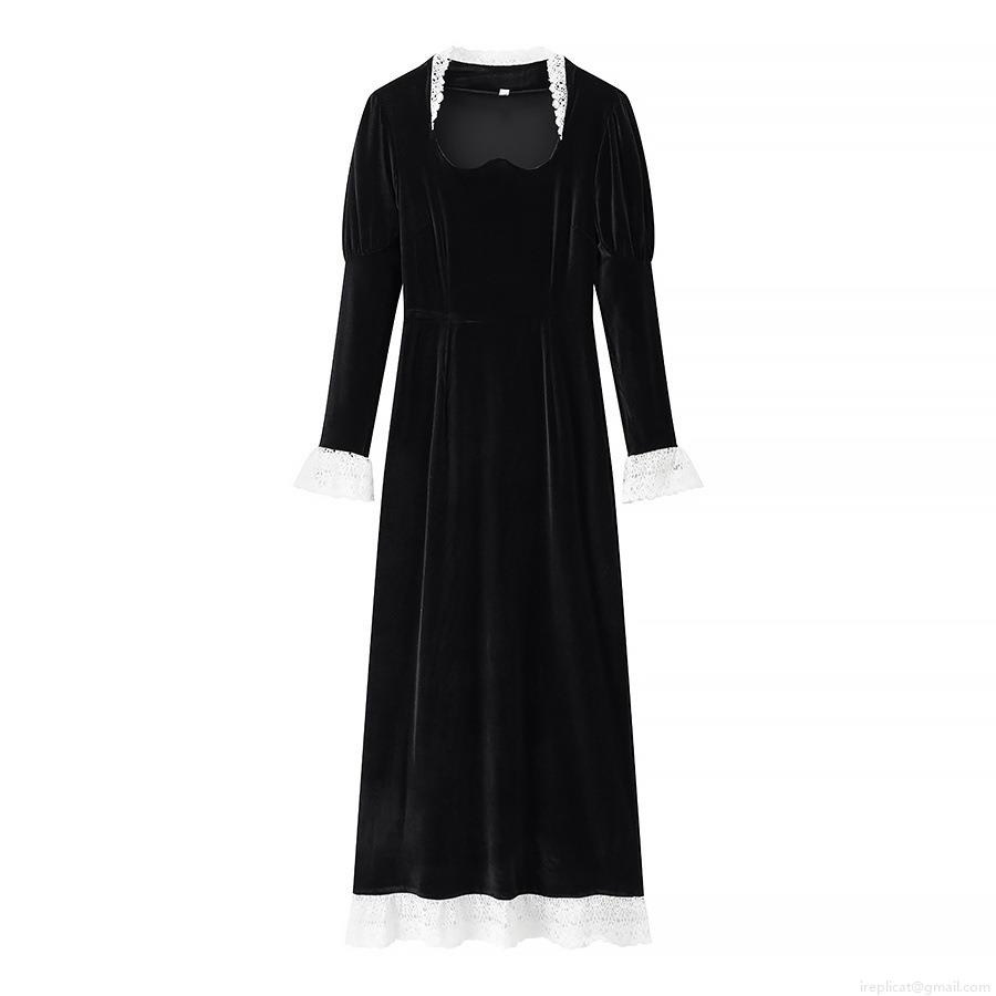 Women's Elegant Vintage Black Velvet Lace Stitching Maxi Dress Long Sleeve U-Neck Gothic Court Style Evening Party Long Gown