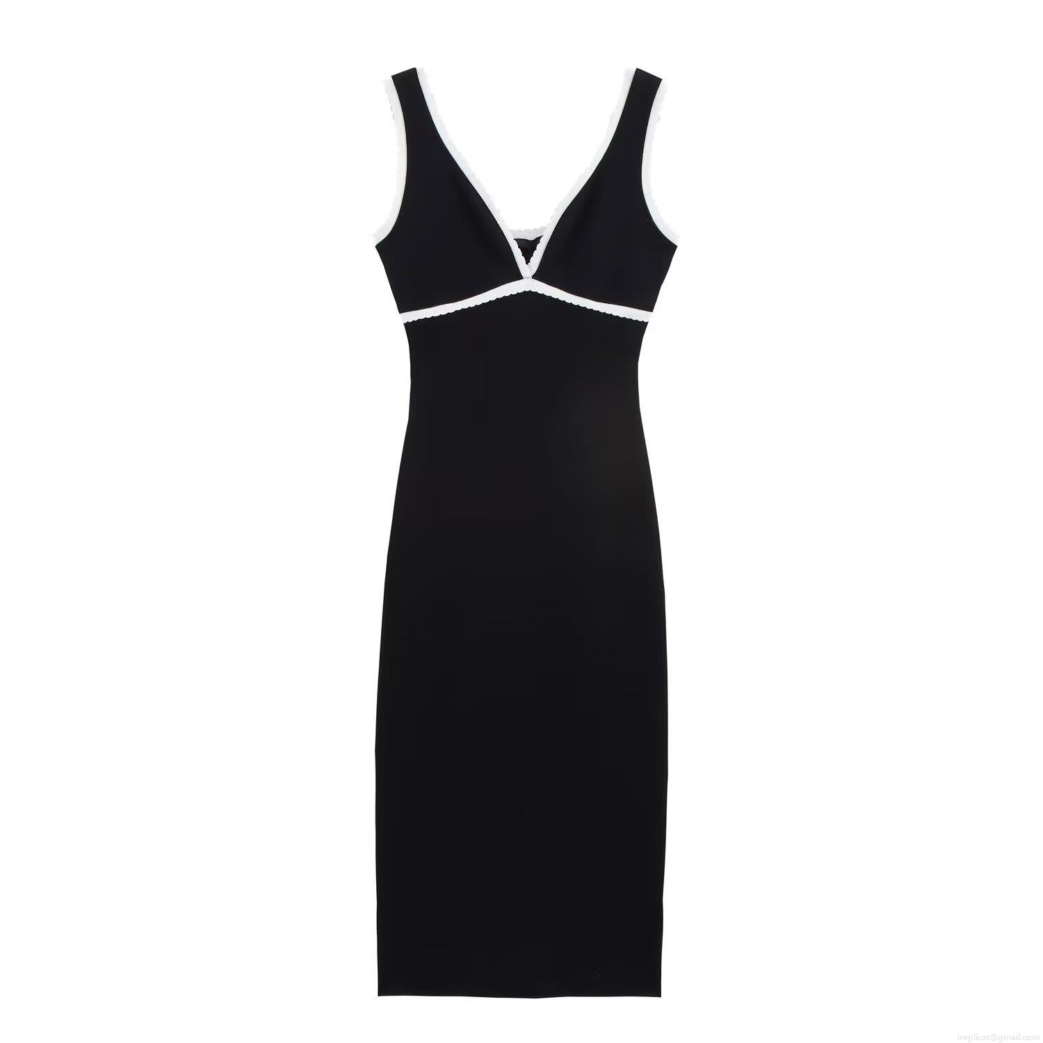 Women's Elegant V-Neck Knitted Maxi Dress Contrast White Lace Trim Sleeveless Camisole Bodycon Dress Evening Party Clubwear Celebrity Style Slim Fit Dress