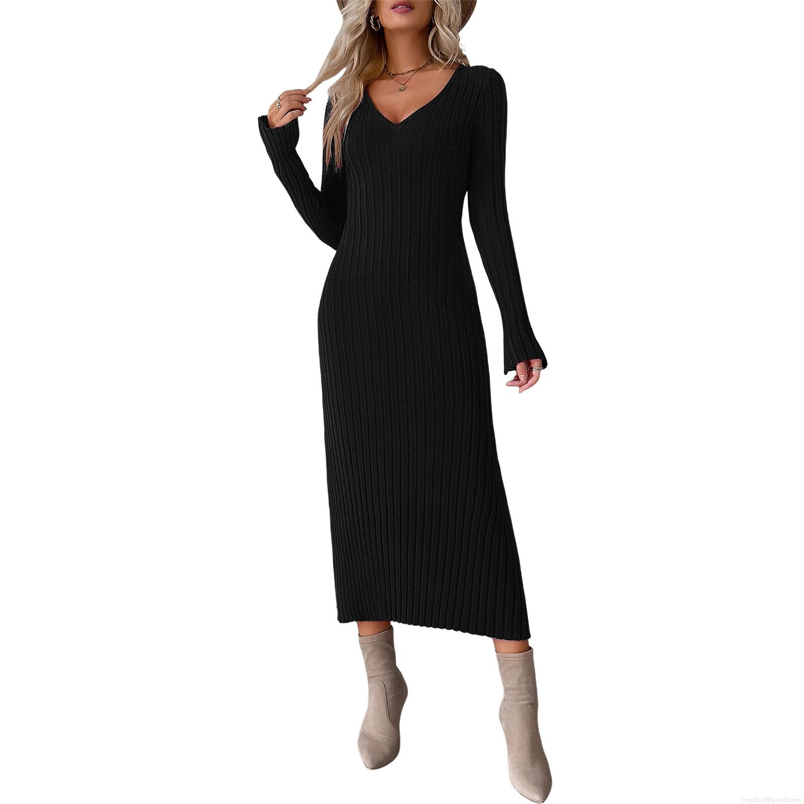 • Women's Elegant V-Neck Long Sleeve Knitted Maxi Dress Slim Fit Ribbed Viscose Sweater Dress For Autumn Winter Office Party Lady