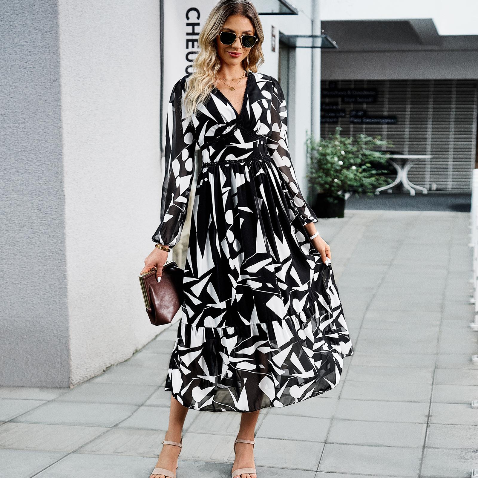 • Women's Elegant V-Neck Long Sleeve Maxi Dress Viscose Printed High Waist A-Line Long Dress For Holiday Leisure Daily Wear