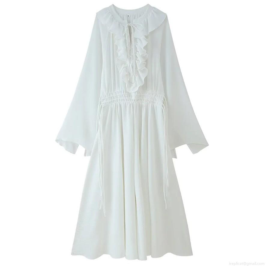 • Women's Elegant V-Neck Ruffle Maxi Dress Polyester Long Flare Sleeve Drawstring Waist Boho Vacation Solid White Long Dress For Women Lady Party