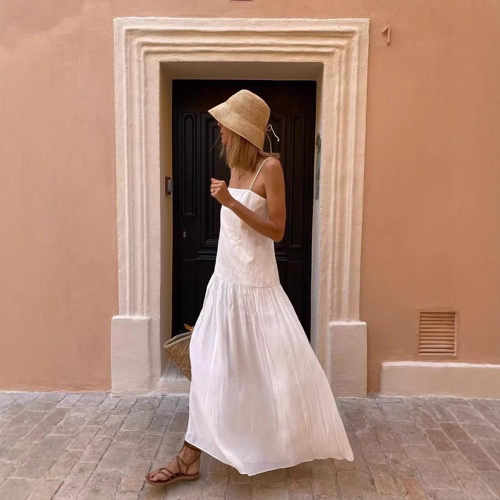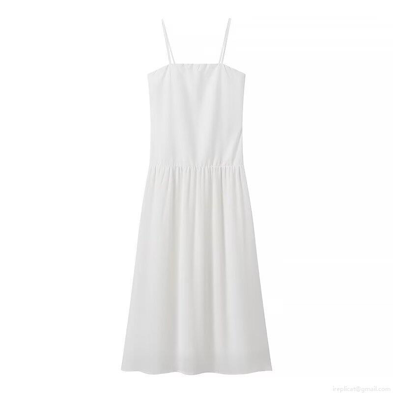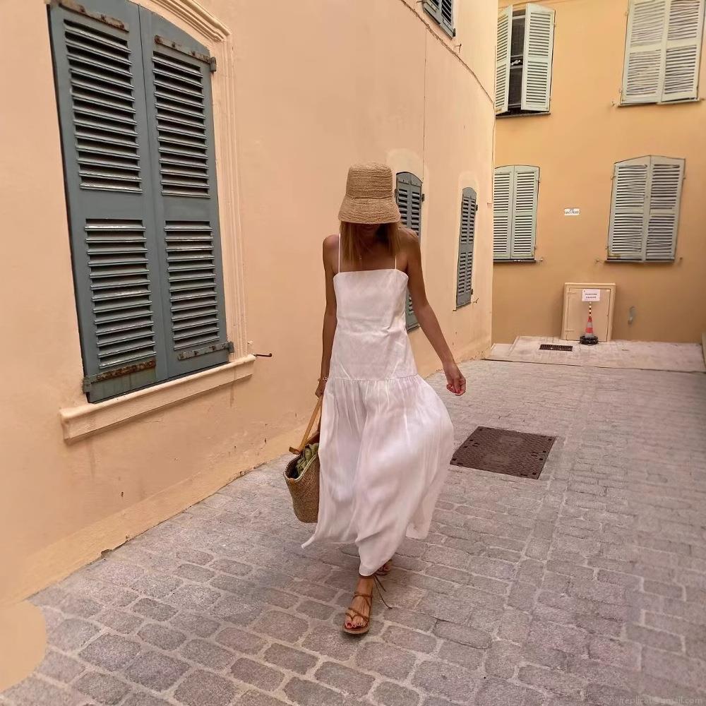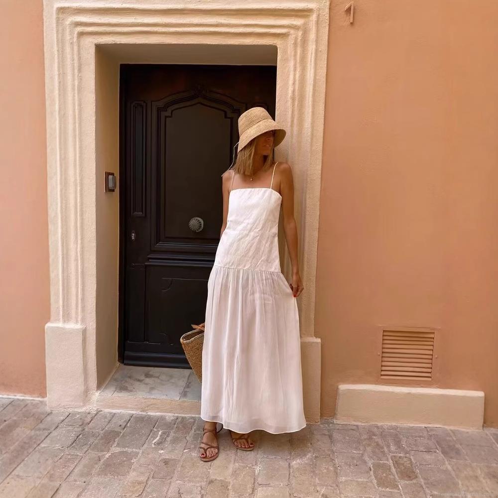 • Women's Elegant White Crinkled Maxi Dress Tiered Spaghetti Strap Square Neck High Waist Polyester Summer Beach Vacation Long Dress