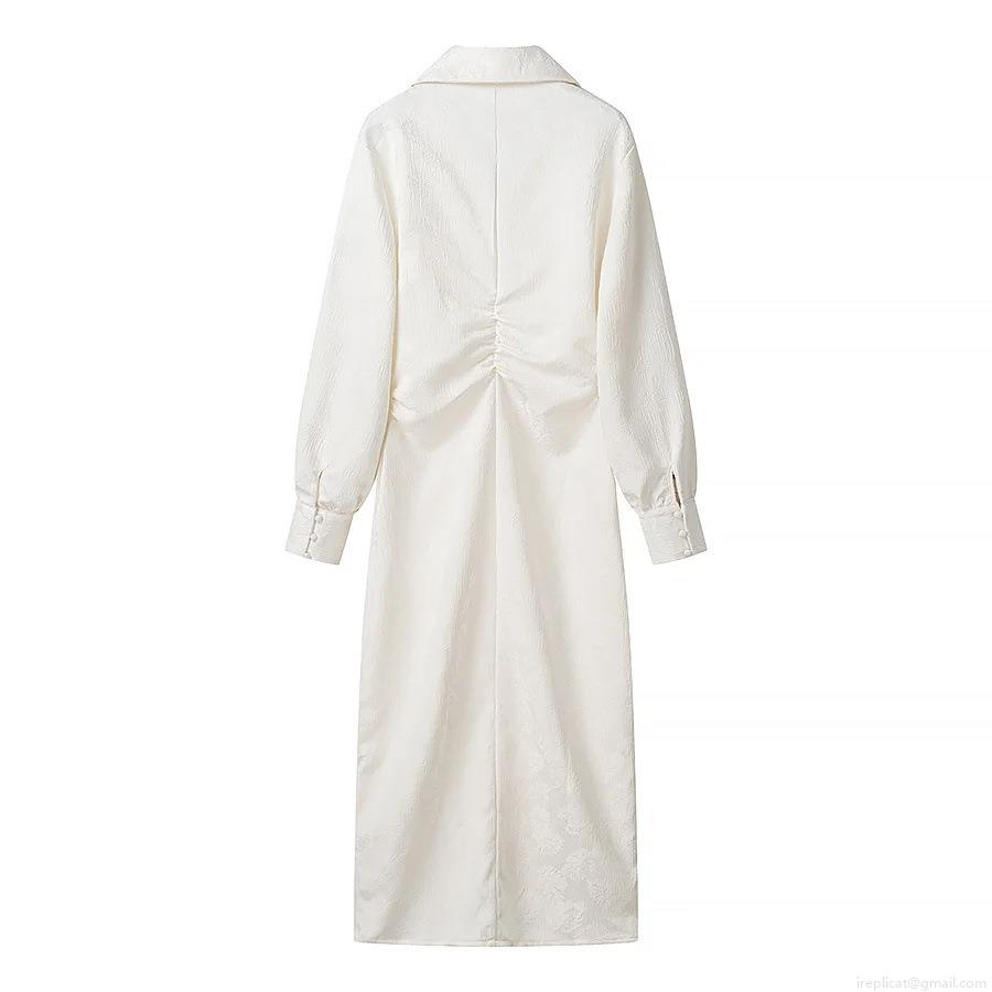 • Women's Elegant White Jacquard Maxi Shirt Dress Long Sleeve Lapel Single Breasted Drawstring Waist Elegant Party Casual Office Dress