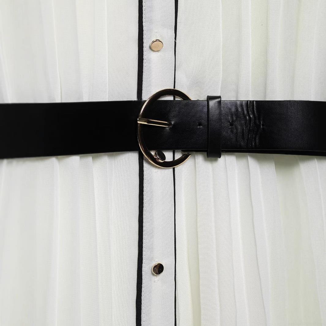Women's European Style Pleated Long Sleeve Dress With Belt Contrast Piping Lapel Maxi Shirt Dress Elegant Solid White Streetwear Long Dress
