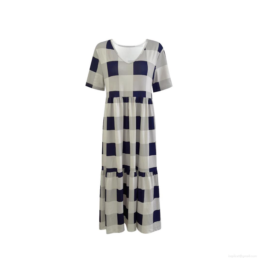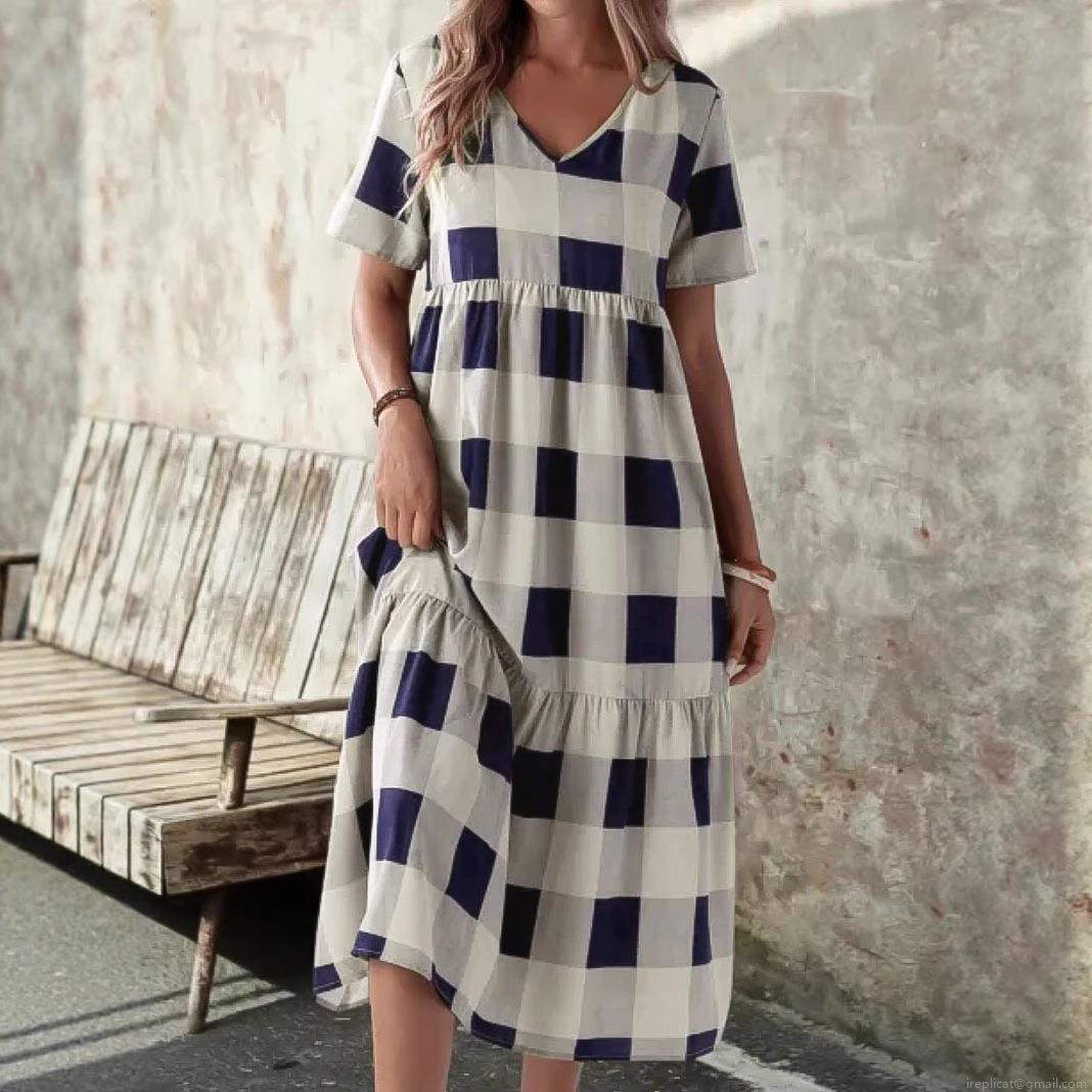 Women's Fashion V-Neck Short Sleeve Plaid Maxi Dress Polyester Spandex Tiered Cake Skirt Casual Summer Beach Loose Long Dress Elegant Streetwear