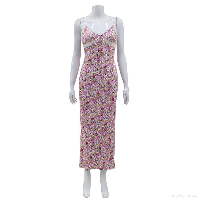 • Women's Floral Print Slip Maxi Dress With Lace Patchwork Sexy V-Neck Sleeveless Slim Fit Summer Beach Party Long Sundress For Ladies