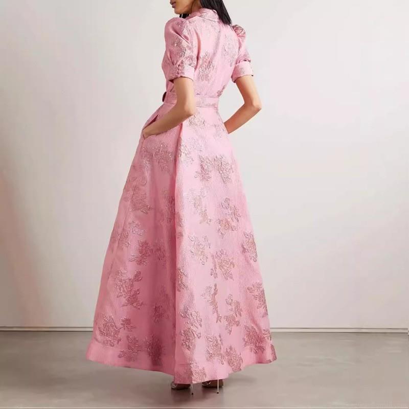 • Women's French Elegant Pink Jacquard Maxi Dress Vintage Short Puff Sleeve Shirt Collar A-Line Party Dress With Belt Retro Chic Summer High Waist Gown