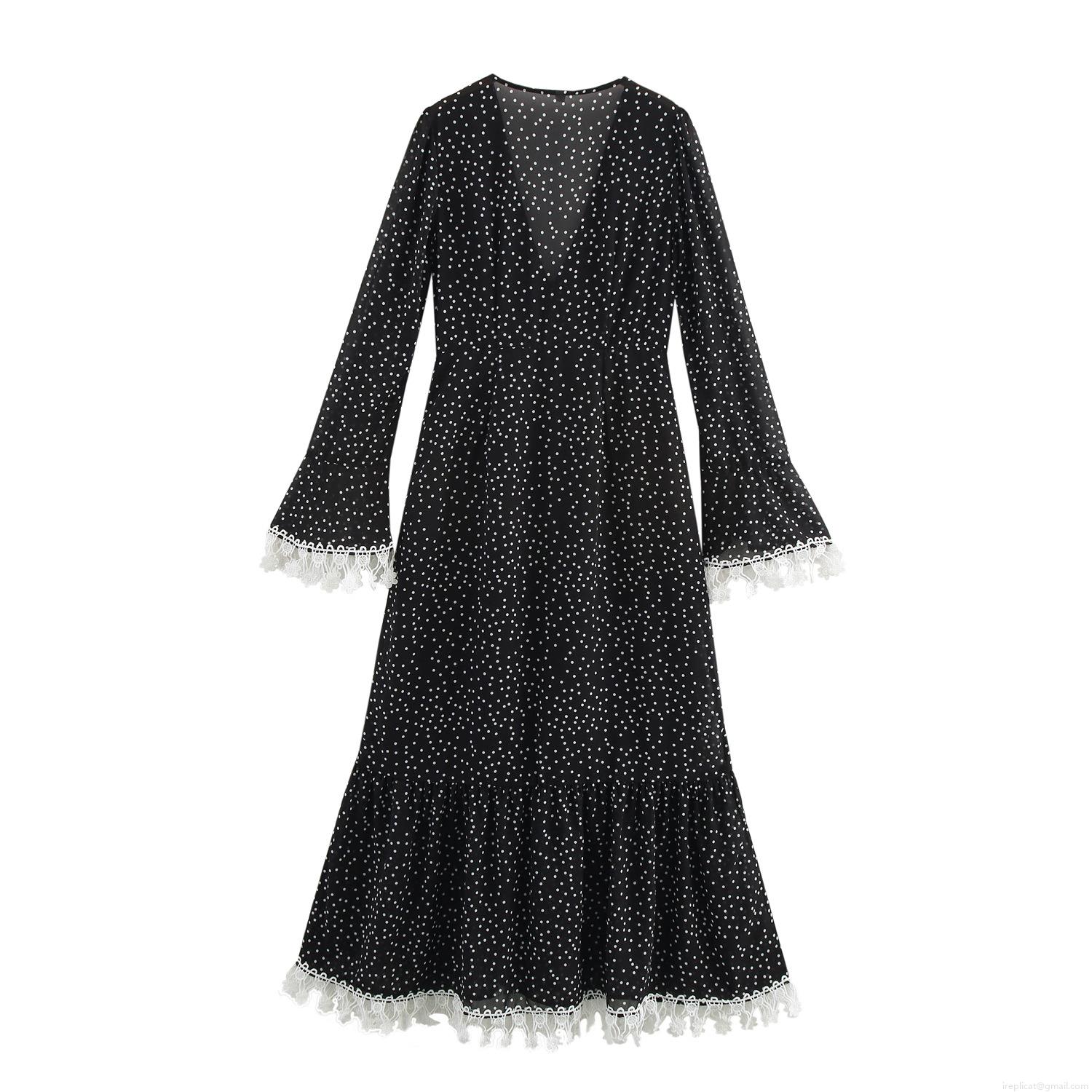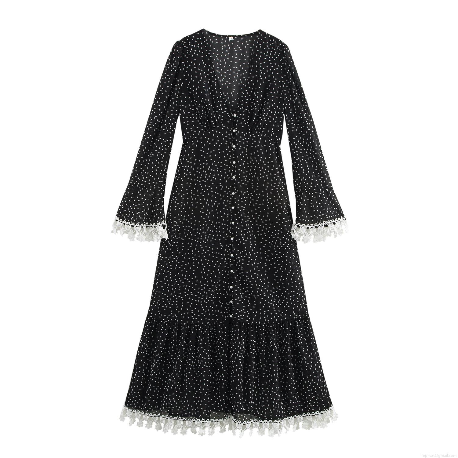 • Women's French Elegant Polka Dot V-Neck Maxi Dress With Lace Trim And Pearl Buttons Long Sleeve Polyester Vintage Slim Fit Dress For Ladies
