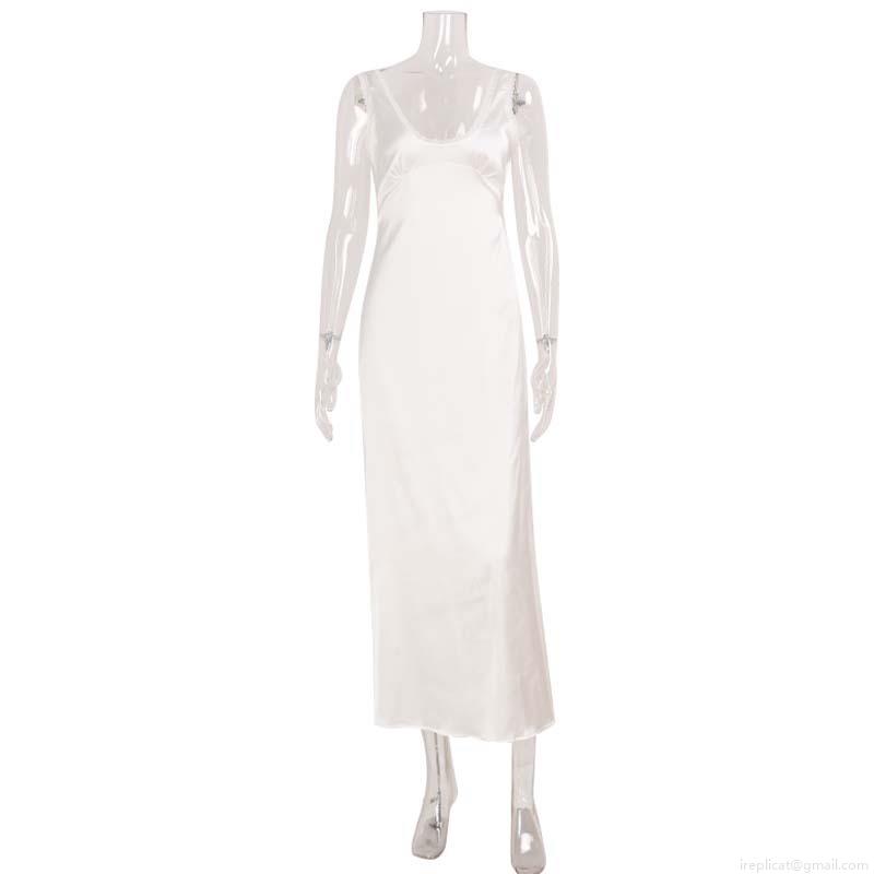 • Women's French Style Satin Maxi Dress Sexy V-Neck Backless Sleeveless Lace Trim Slim Fit Slip Dress For Summer Party Wedding Elegant White