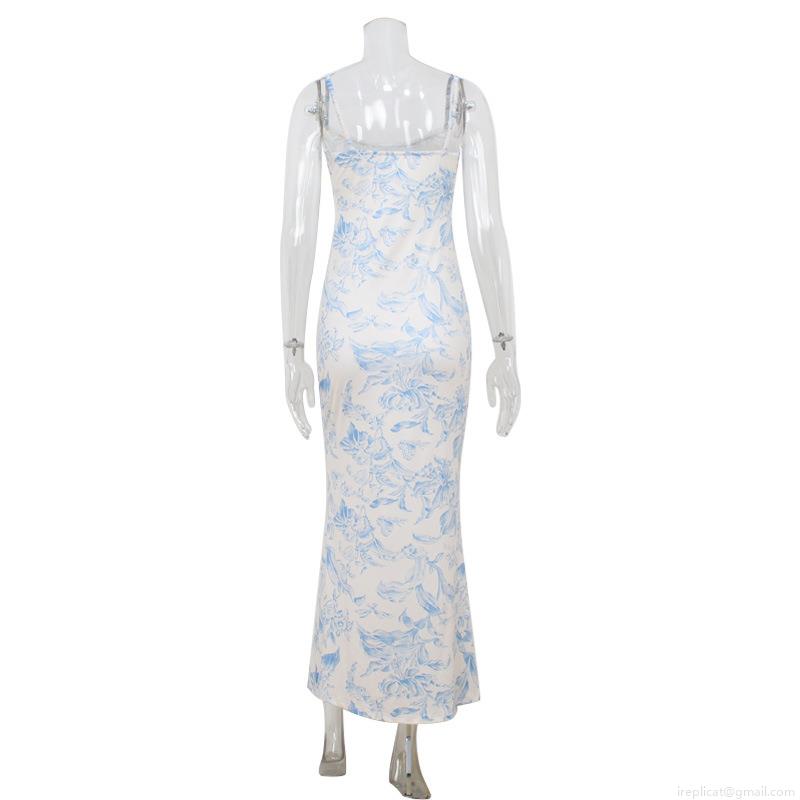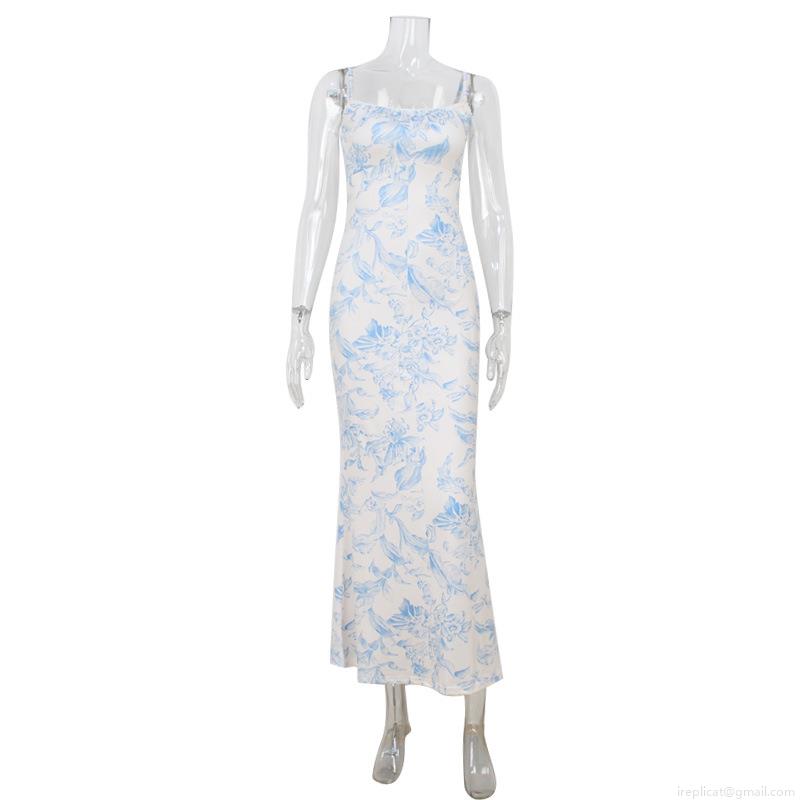 • Women's French Vintage Blue and White Floral Print Camisole Maxi Dress Slim Fit High Waist Sleeveless Summer Vacation Backless Sundress