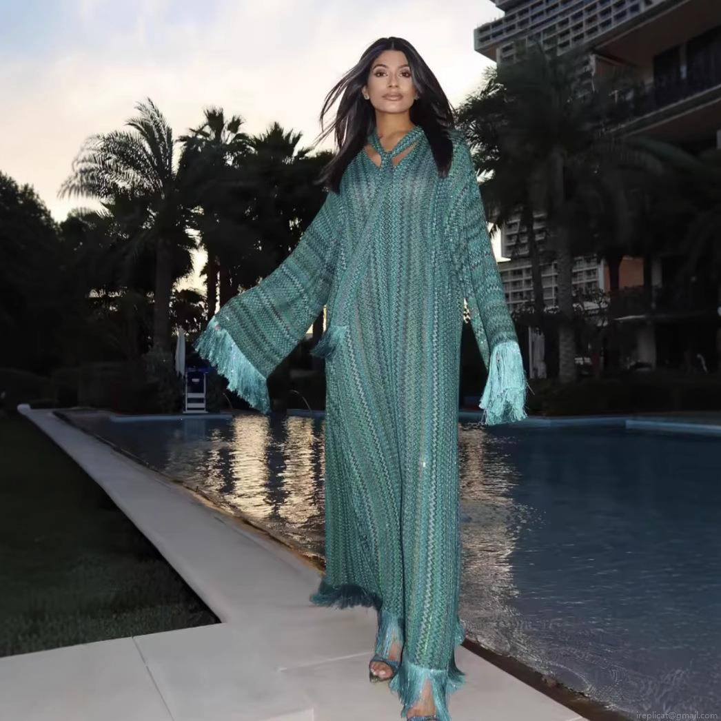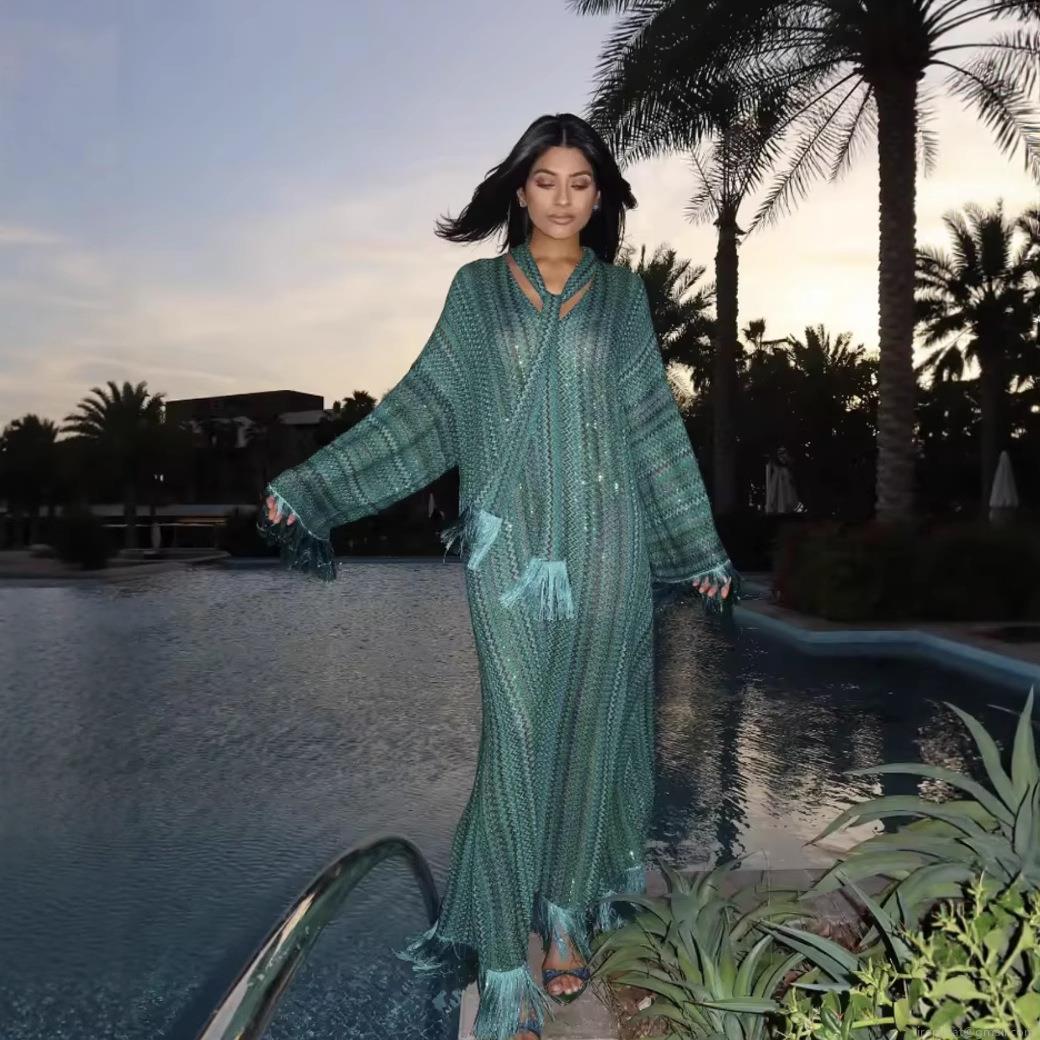 • Women's Green Sequin Zigzag Maxi Dress With Tassels V-Neck Long Sleeve Bodycon Evening Party Gown Vacation Dress With Choker Neckband