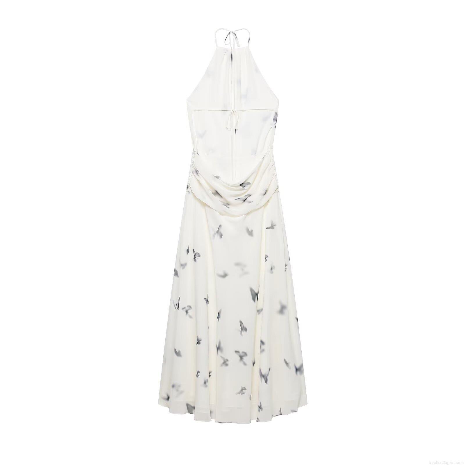• Women's Halter Neck Backless Maxi Dress Polyester Chiffon Butterfly Print Tie-up Pleated Long Dress For Summer Party Vacation Elegant Streetwear