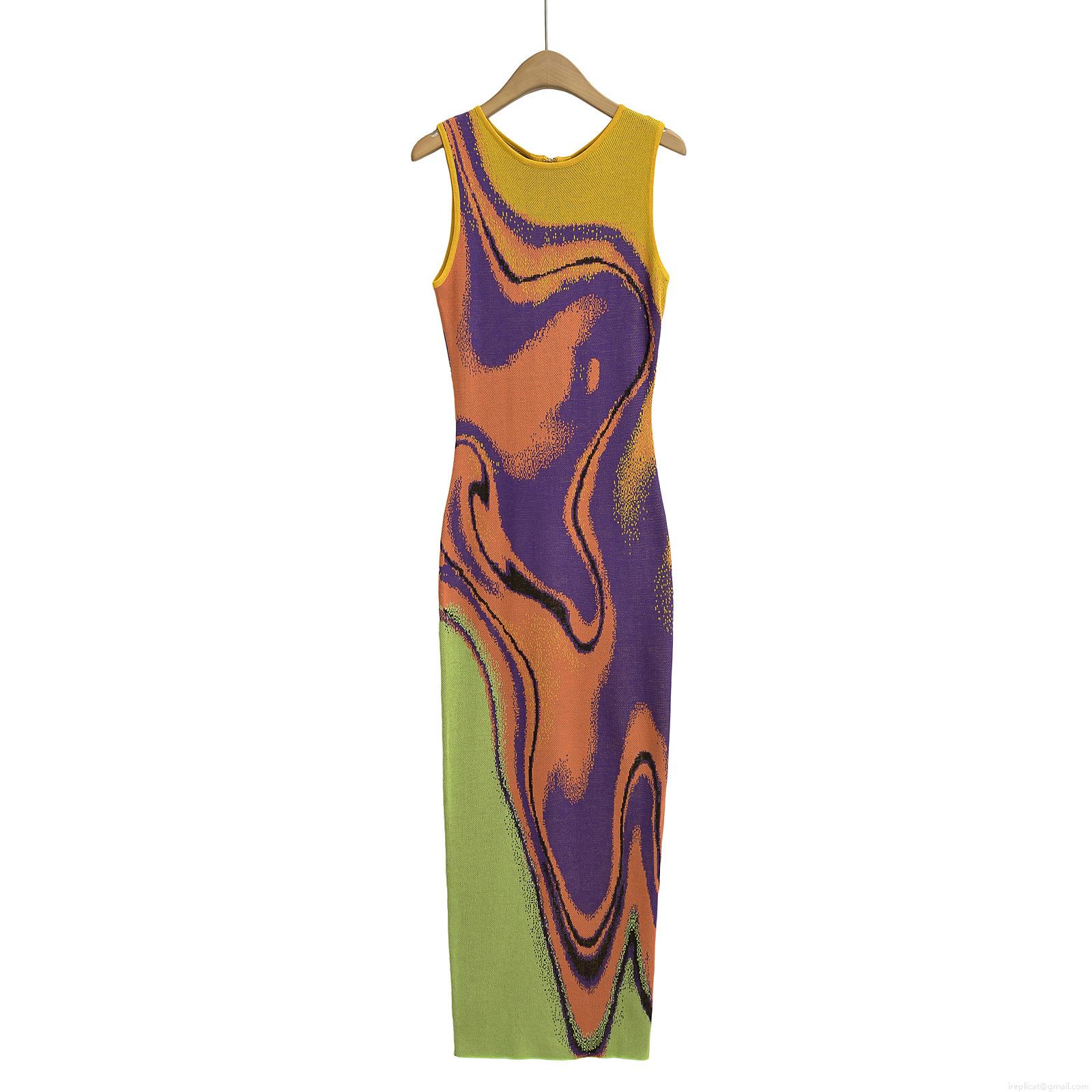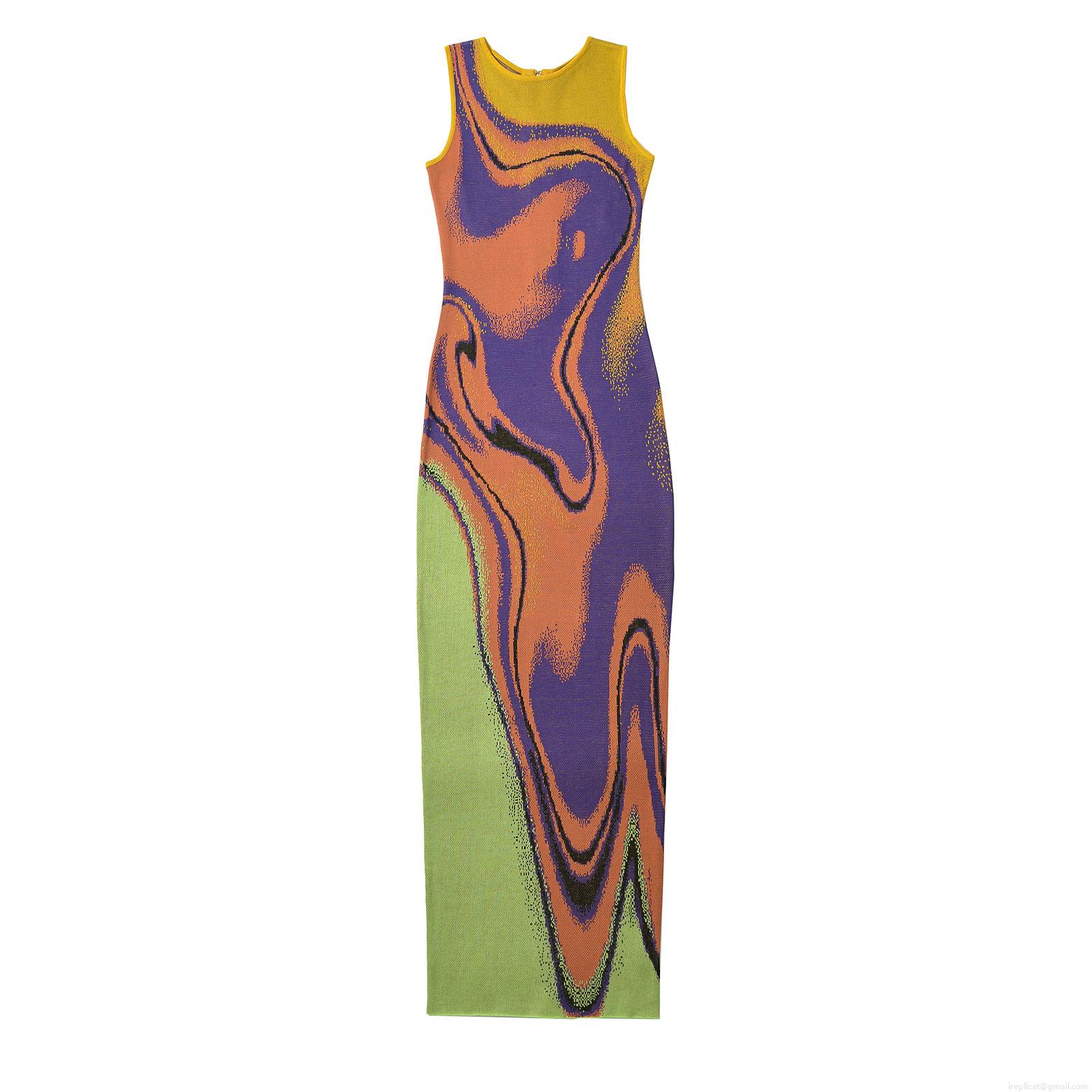 • Women's Knitted Abstract Jacquard Sleeveless Bodycon Maxi Dress Polyester Contrast Color Round Neck Sexy Slim Fit Long Dress for Party Vacation