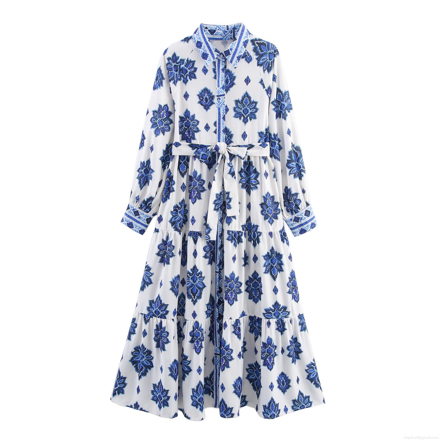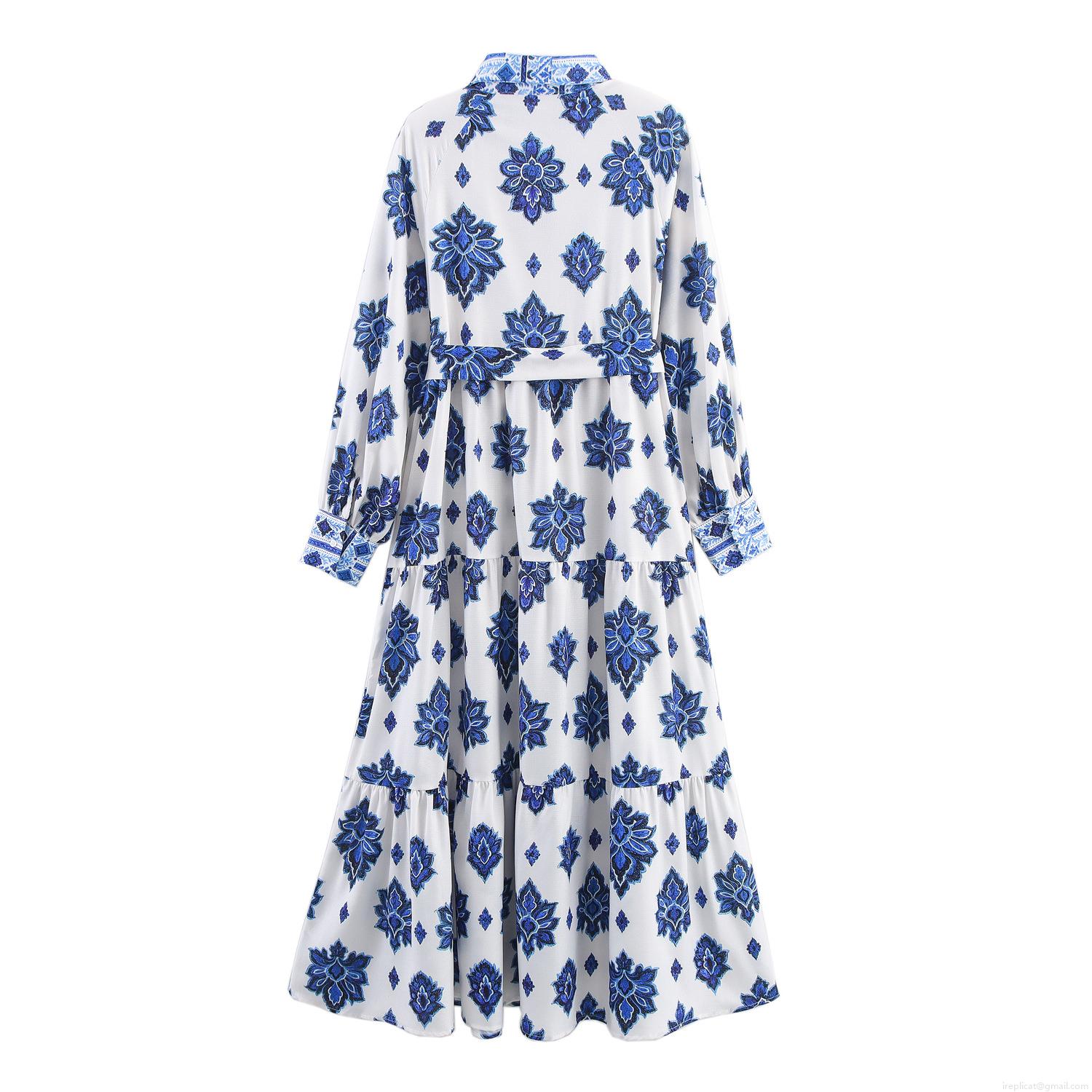 Women's Long Sleeve Shirt Maxi Dress Blue White Porcelain Floral Print Tiered Long Dress With Waist Tie Vacation Beach Bohemian Style Elegant Gown For Lady