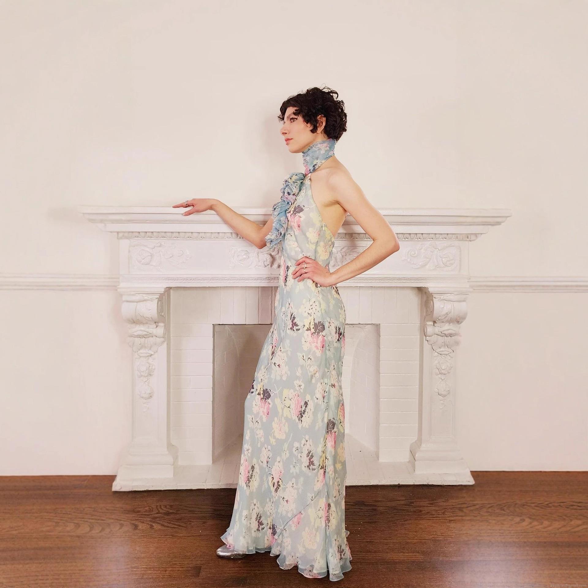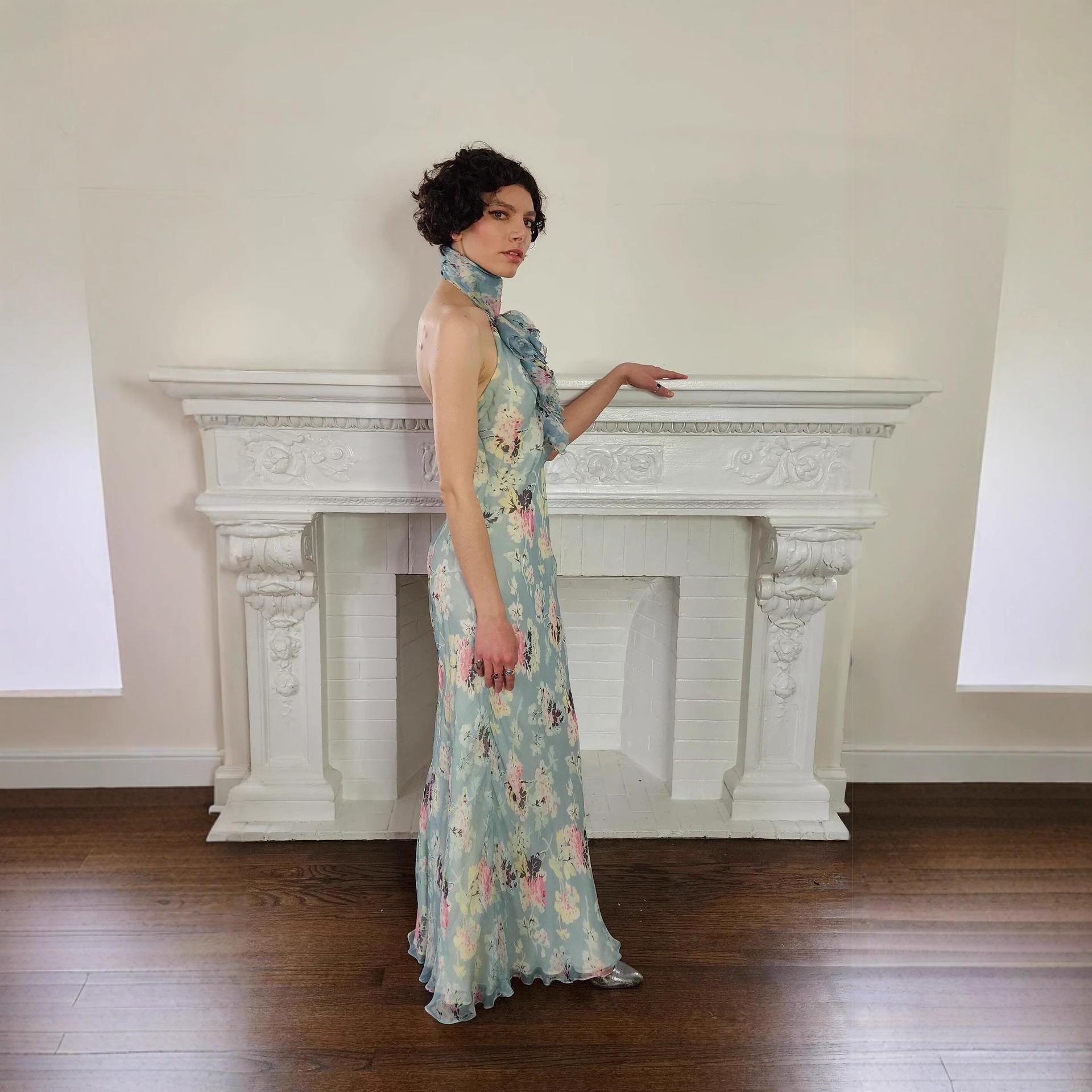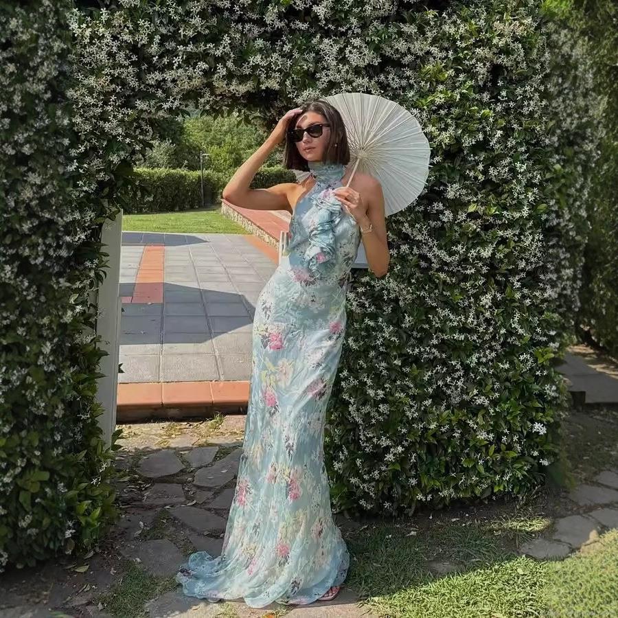 • Women's Maxi Dress French Vintage Floral Halter Neck Sleeveless Ruffle High Waist Chiffon Flowy Long Dress Summer Party Vacation Elegant Sundress
