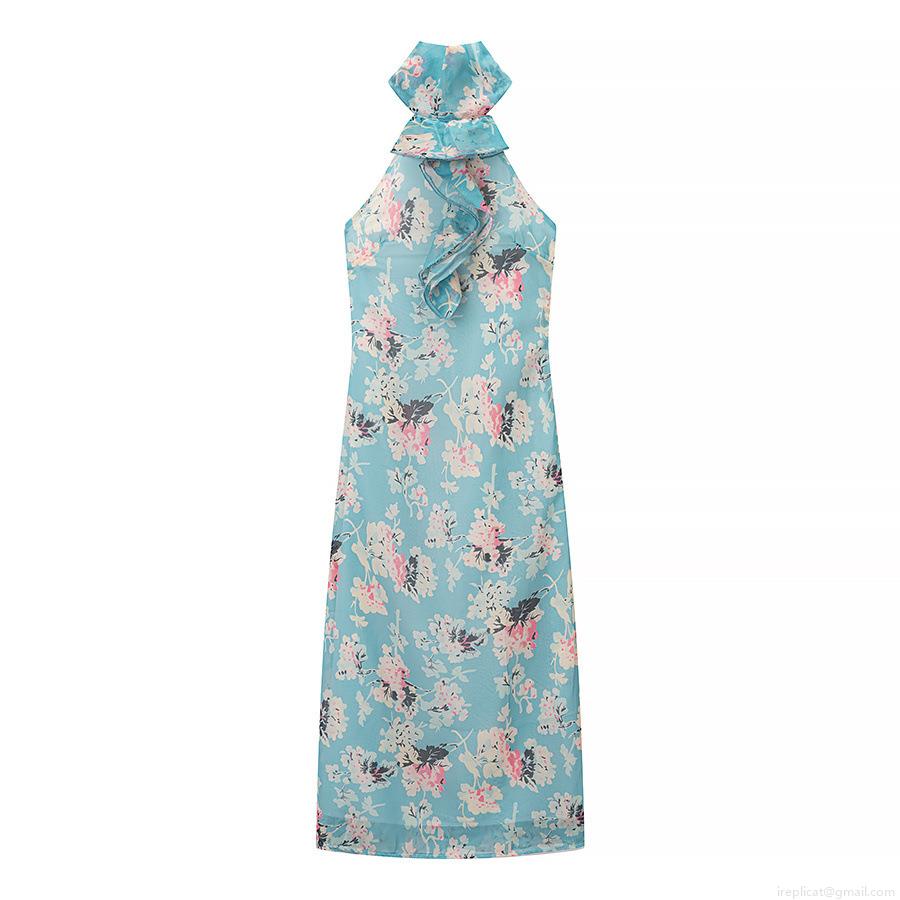 Wood Ear Edge, Floral Pattern, Ruffles, Printing, Neckband, Backless